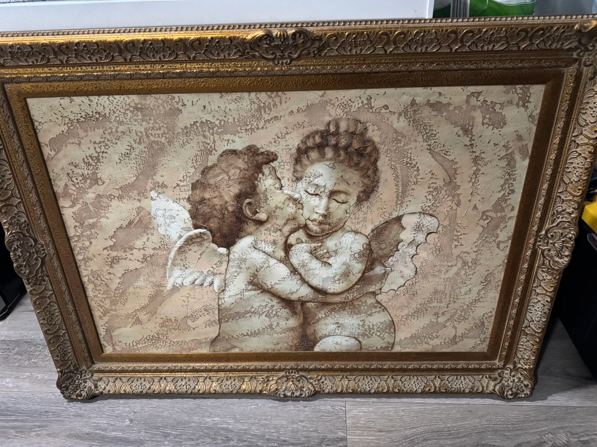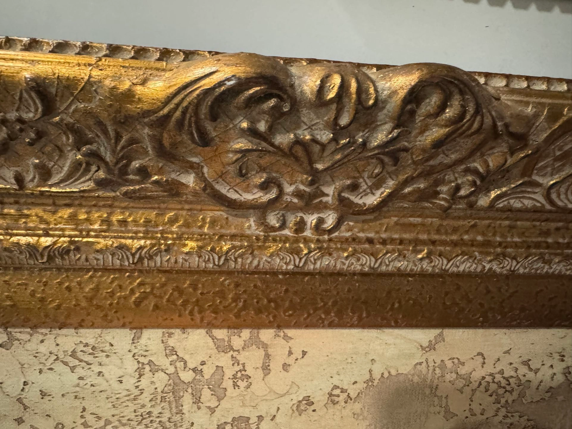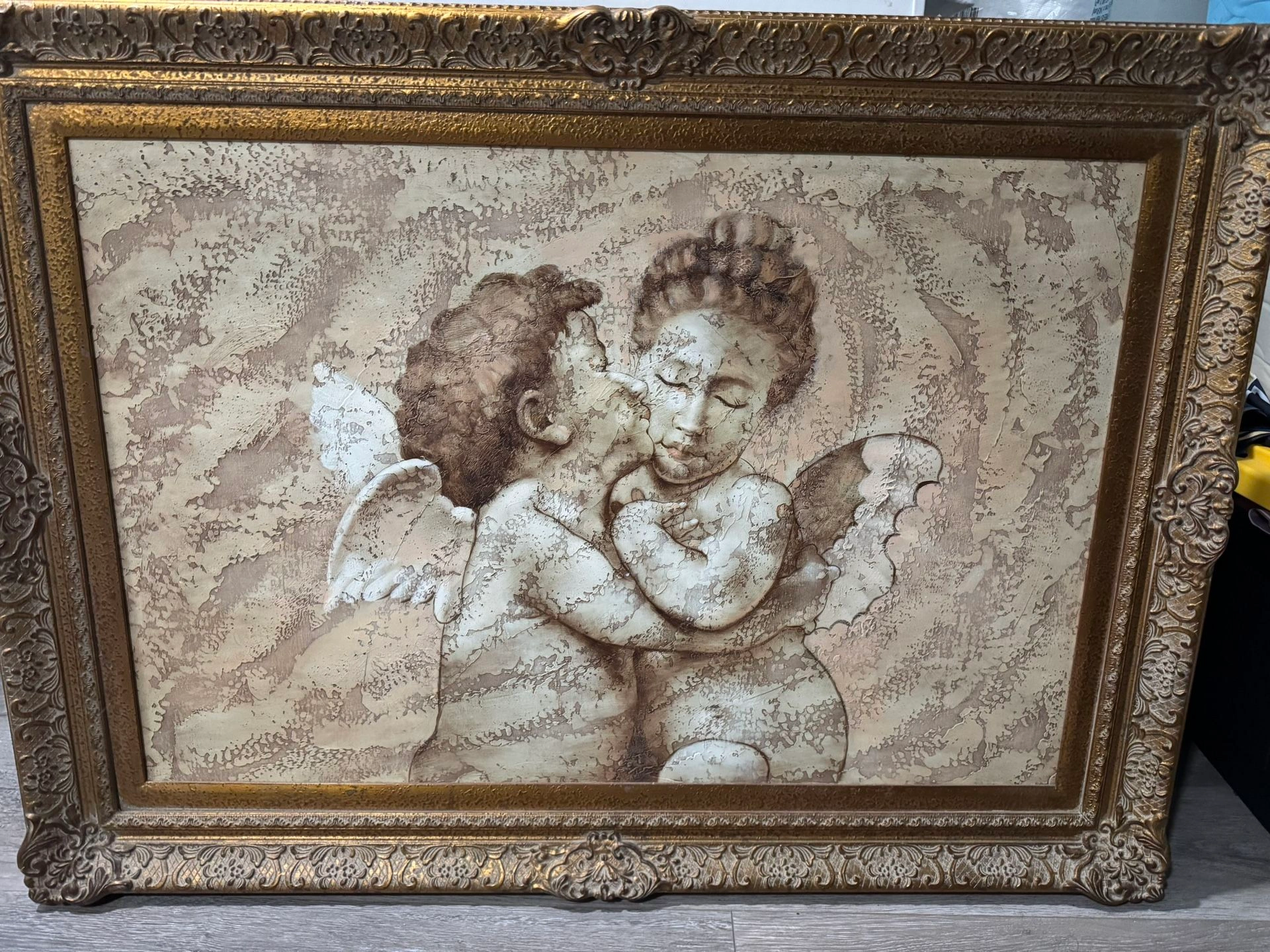 Textured Painting on canvas. Wood Gold Antique Frame collectible. Real paint not printed. Size: Large (up to 60in.) Color: Beige Style: Art Deco