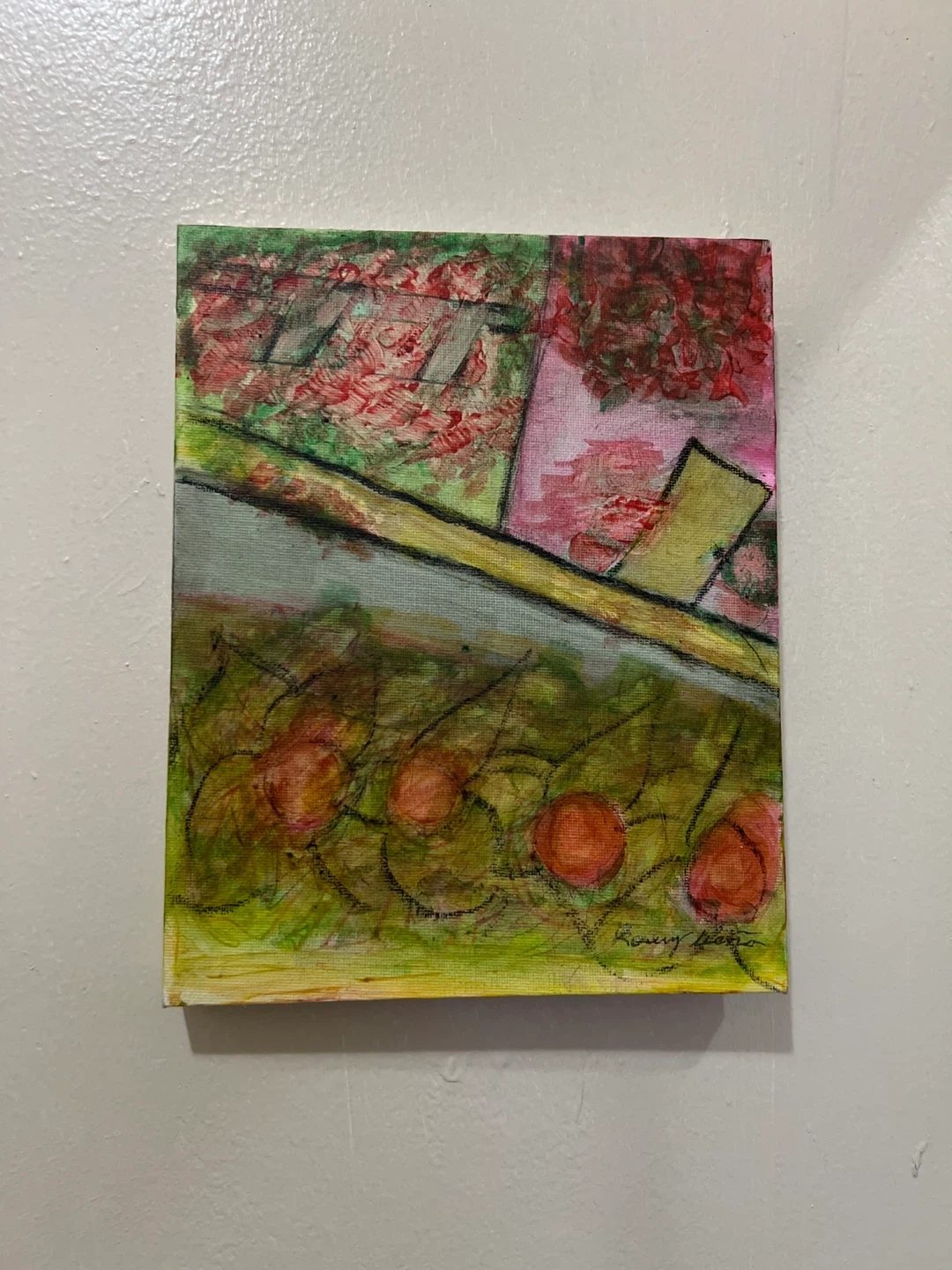 Is a painting of a beautiful view of the street with flower and a door, nice to decorate a space of your home.