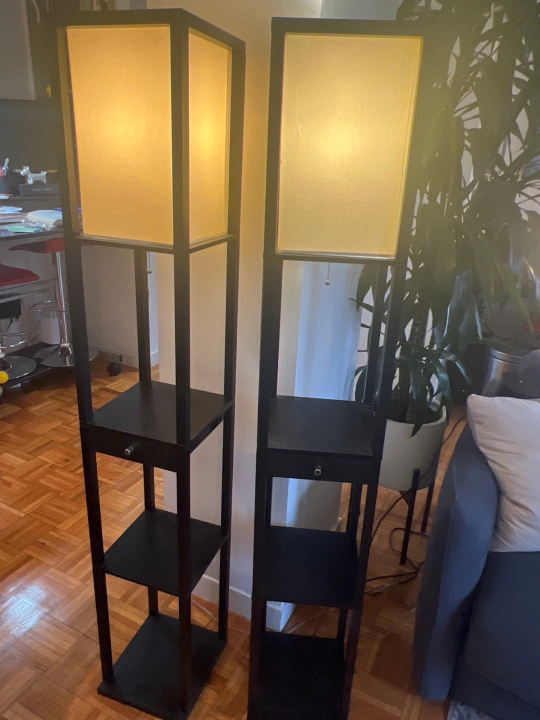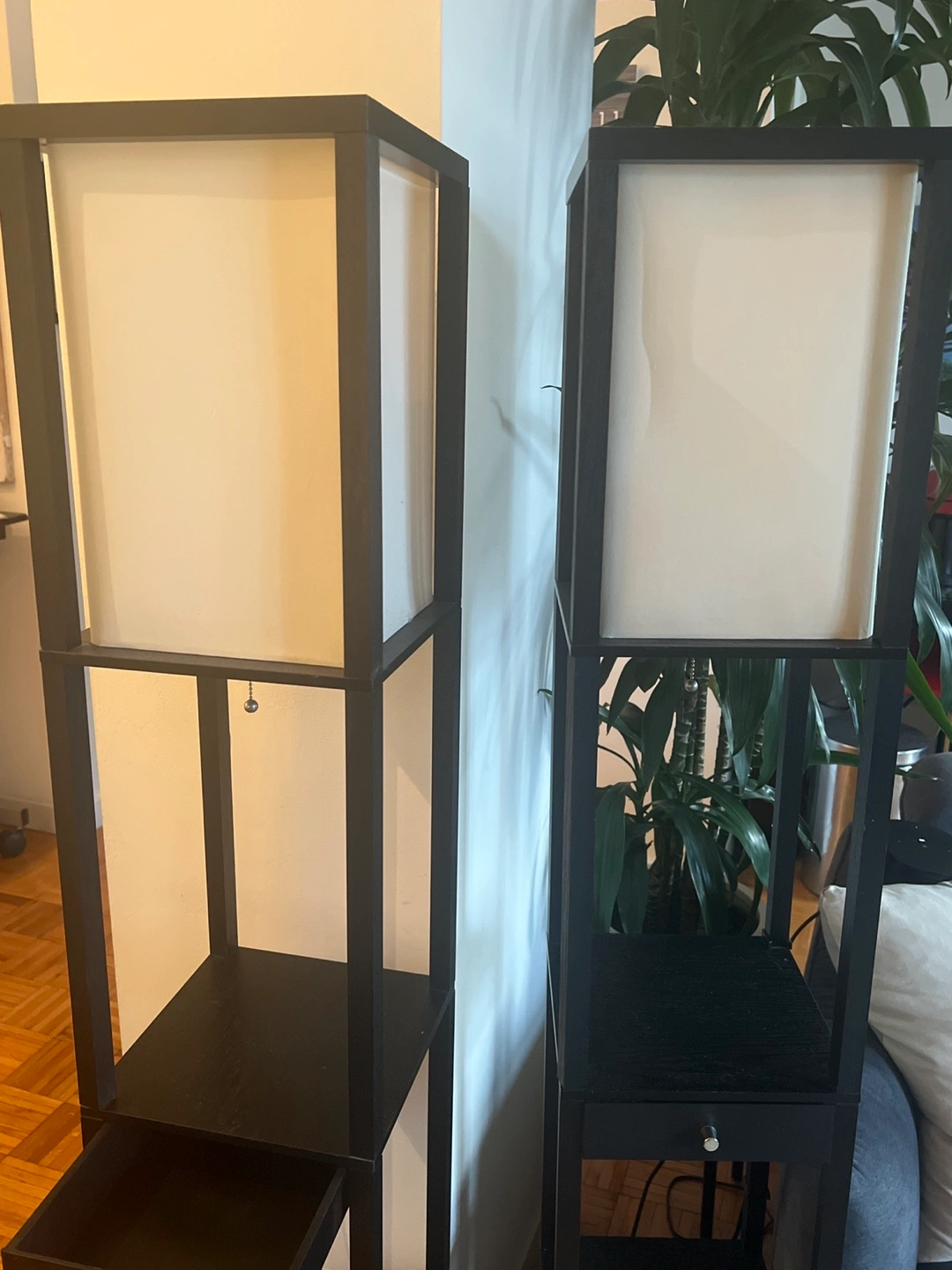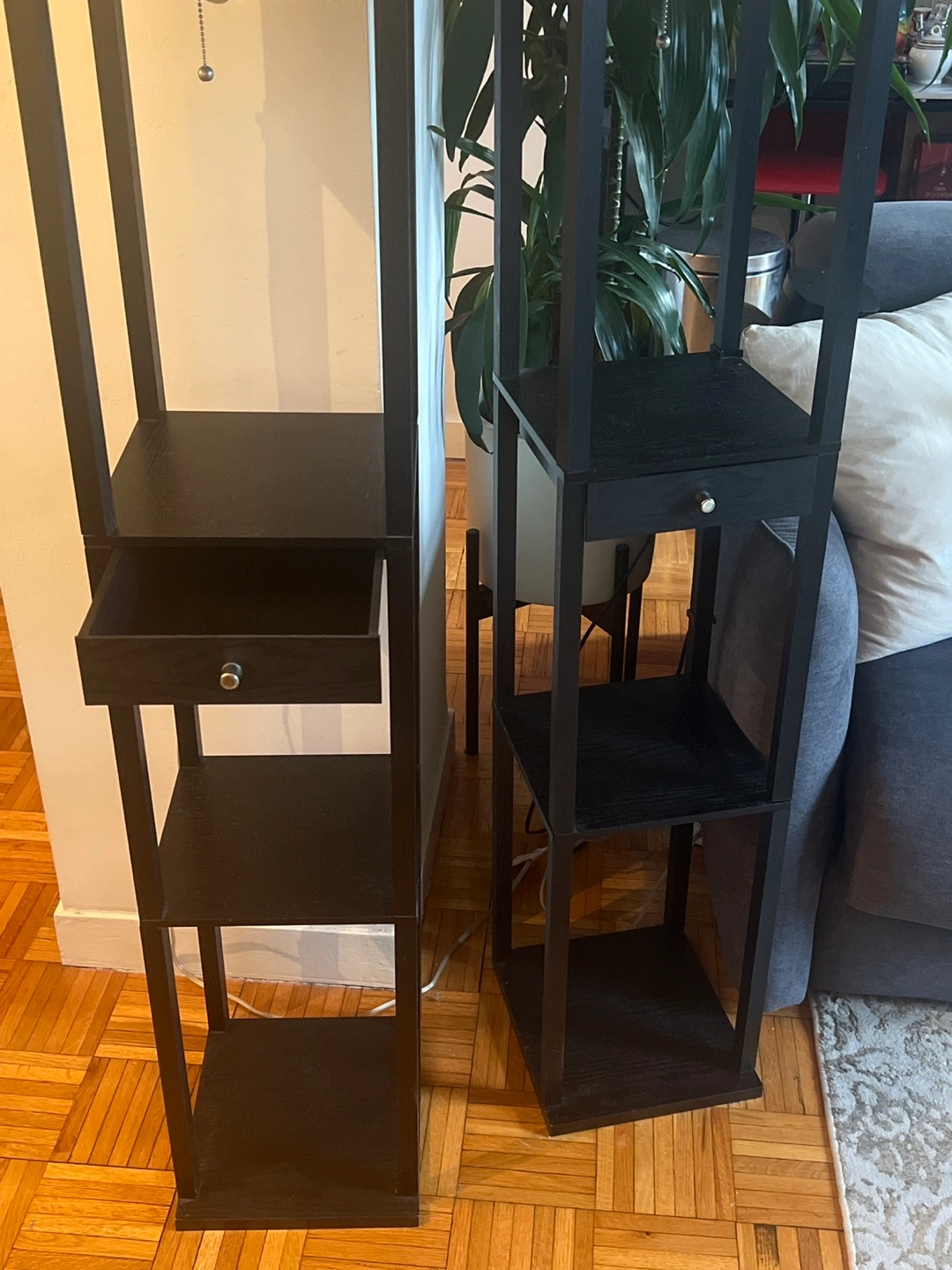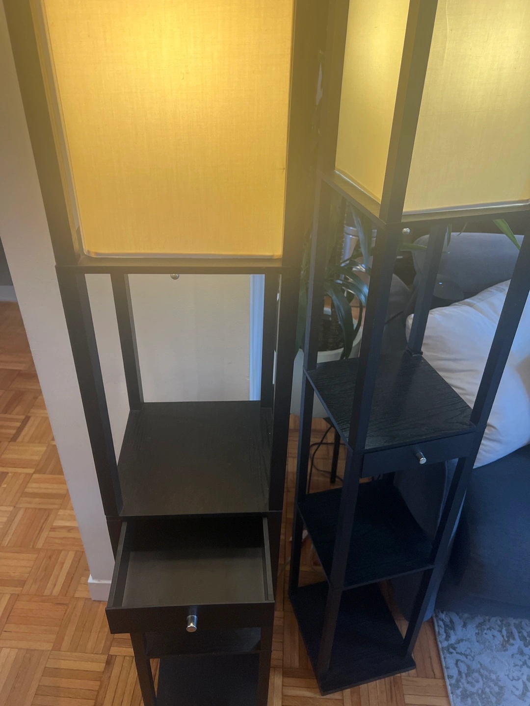87Two matching black floor lamps. Each features a square shade, shelves, and a small drawer. Minimalist design. Great for living room or bedroom.