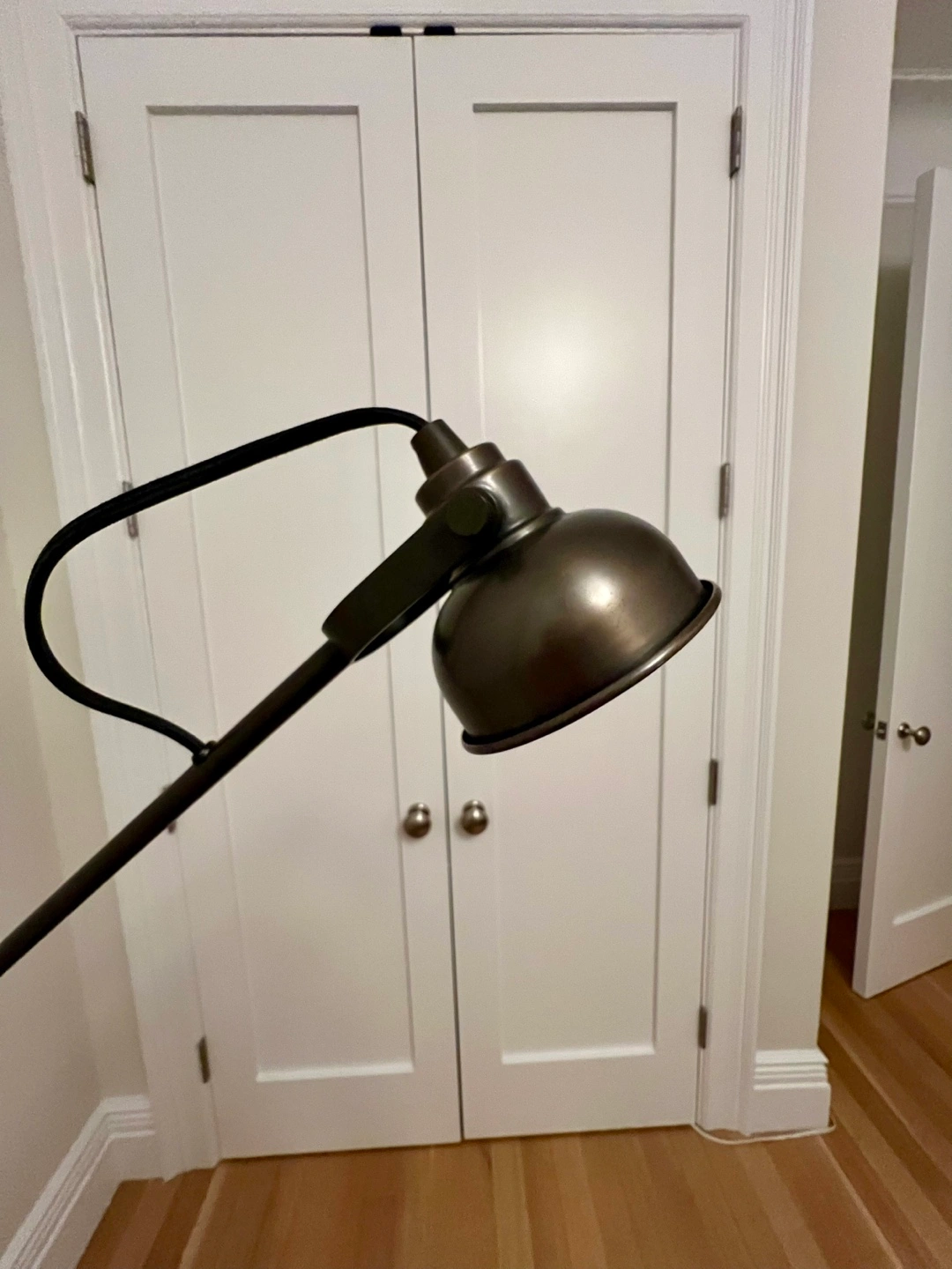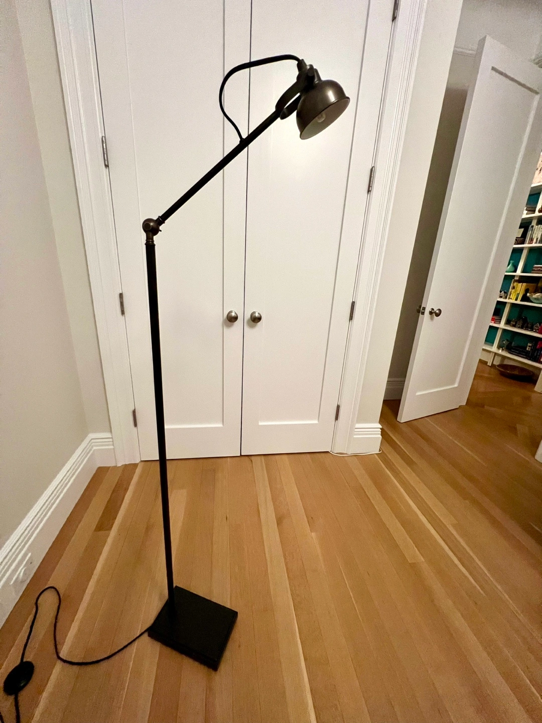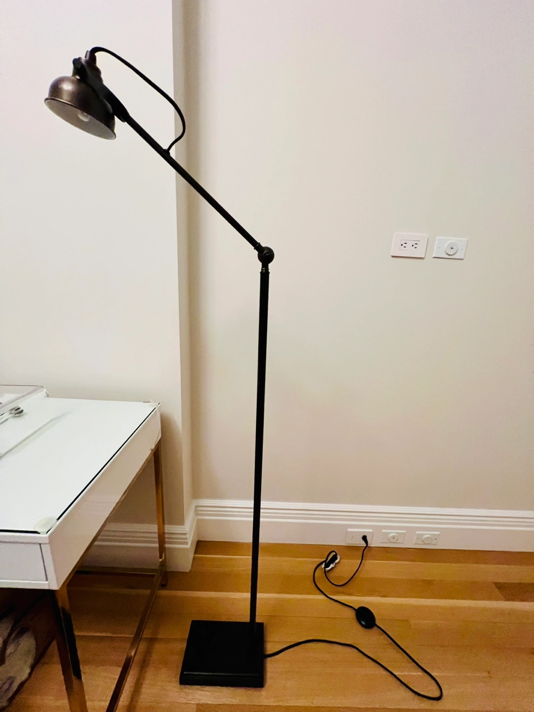 Pair of “Seville” LED floor lamps from Pottery Barn. Dark bronze/brass finish. Floor on/off button. Adjustable angle. Versatile- can be used as reading lamps, bedside lamps, etc…. Work well with a variety of decors- industrial, classic, modern, vintage…. In perfect condition. Small footprint so they are ideal for city apartment spaces. Pick up on upper west side of Manhattan.
