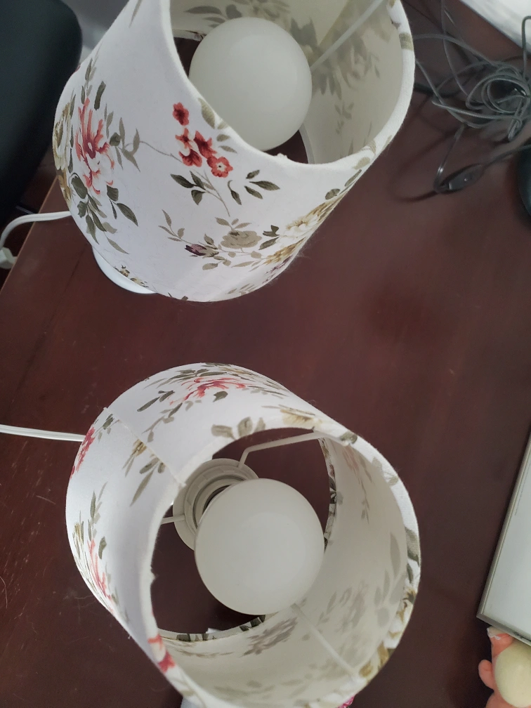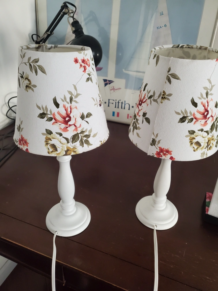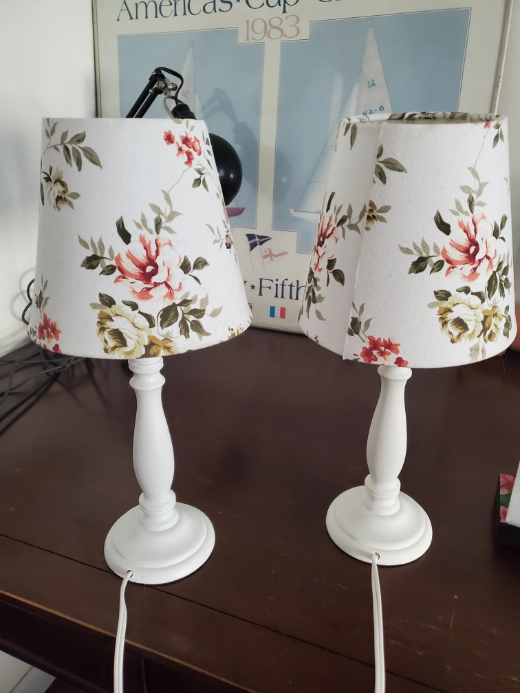 Here's a pair of adorable table lamps! They feature a white base and a floral patterned lampshade. These lamps would be perfect for adding a touch of charm to any room