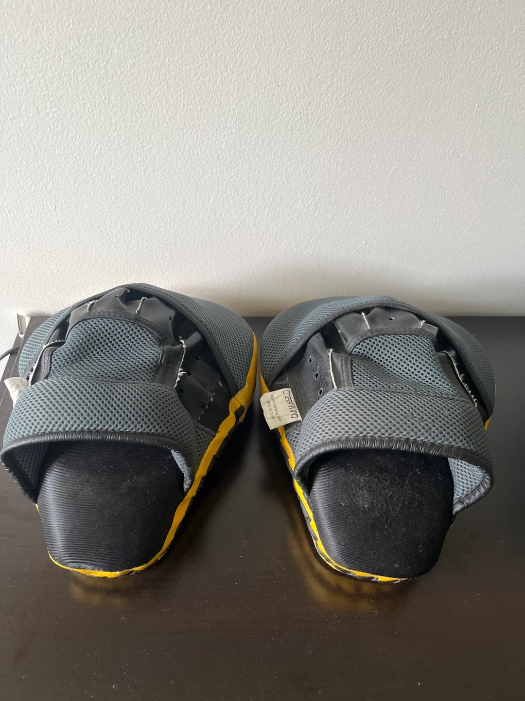 Selling a pair of focus mitts in good condition! They are black and yellow, perfect for boxing or martial arts training. The model number is W8651. They have a comfortable fit and are ready for your next workout