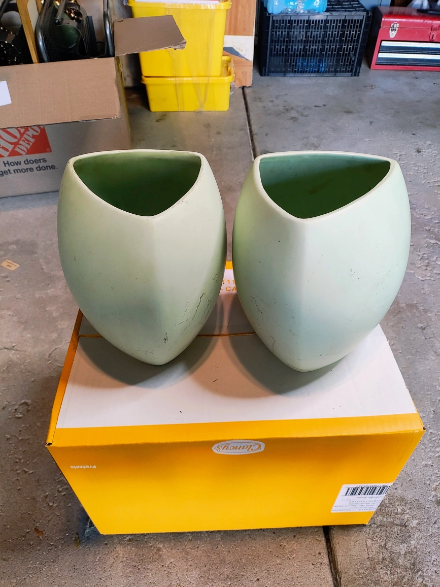 Selling a pair of green ceramic vases. They have a unique, modern shape that would look great in any home. They are in used condition, with some signs of wear.