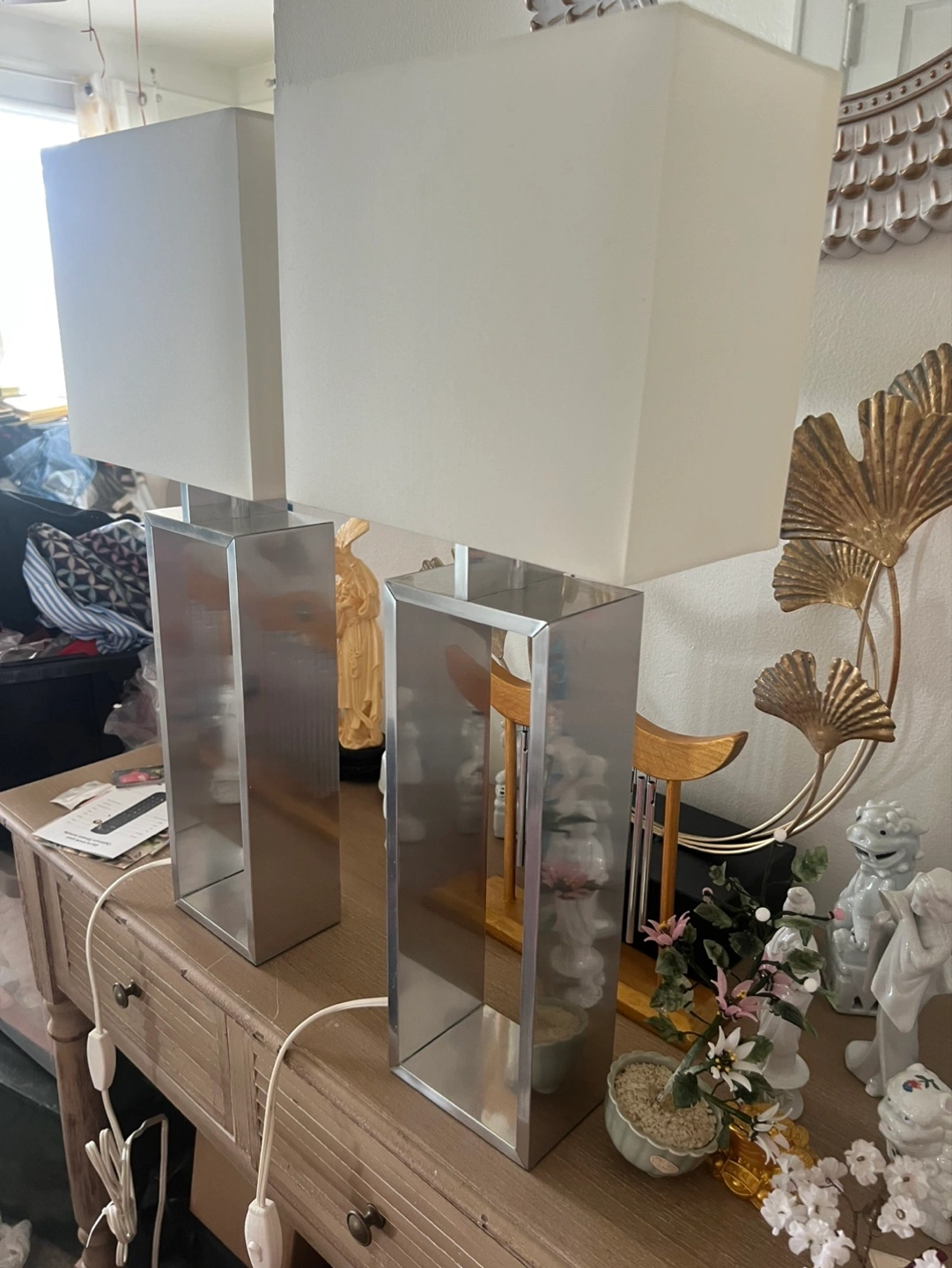 Elegant pair of table lamps. Brushed silver rectangular bases. White square shades. Modern style. Perfect for a living room or bedroom.