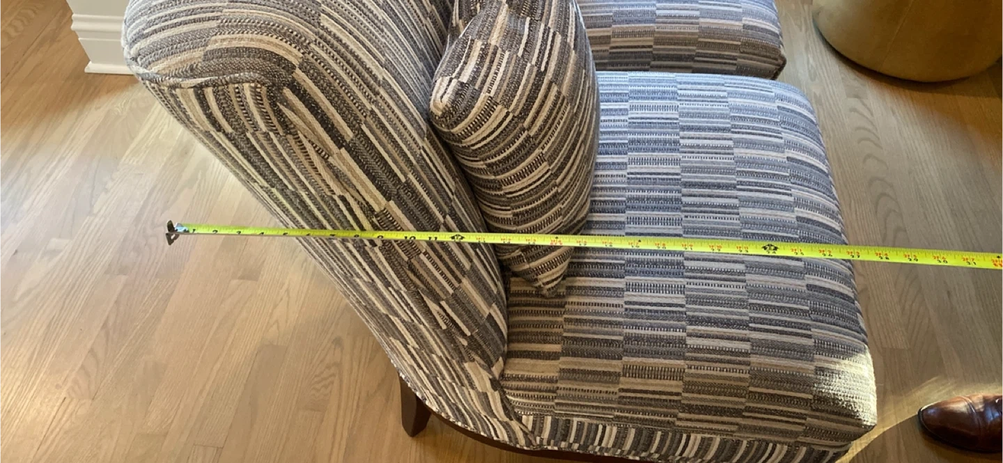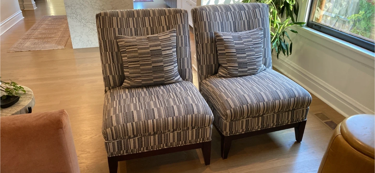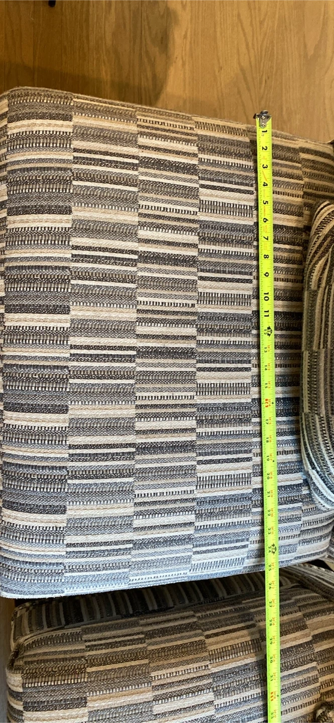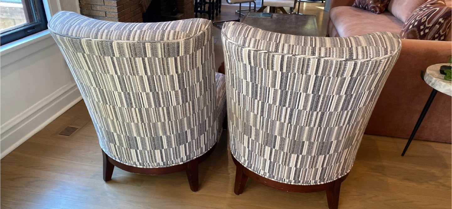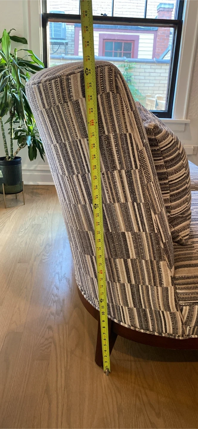 5Selling a pair of accent chairs with a stylish striped pattern and matching pillows. They're in great shape and would look lovely in a living room or bedroom. The height is approximately 40 inches and the seat is around 25 inches wide.