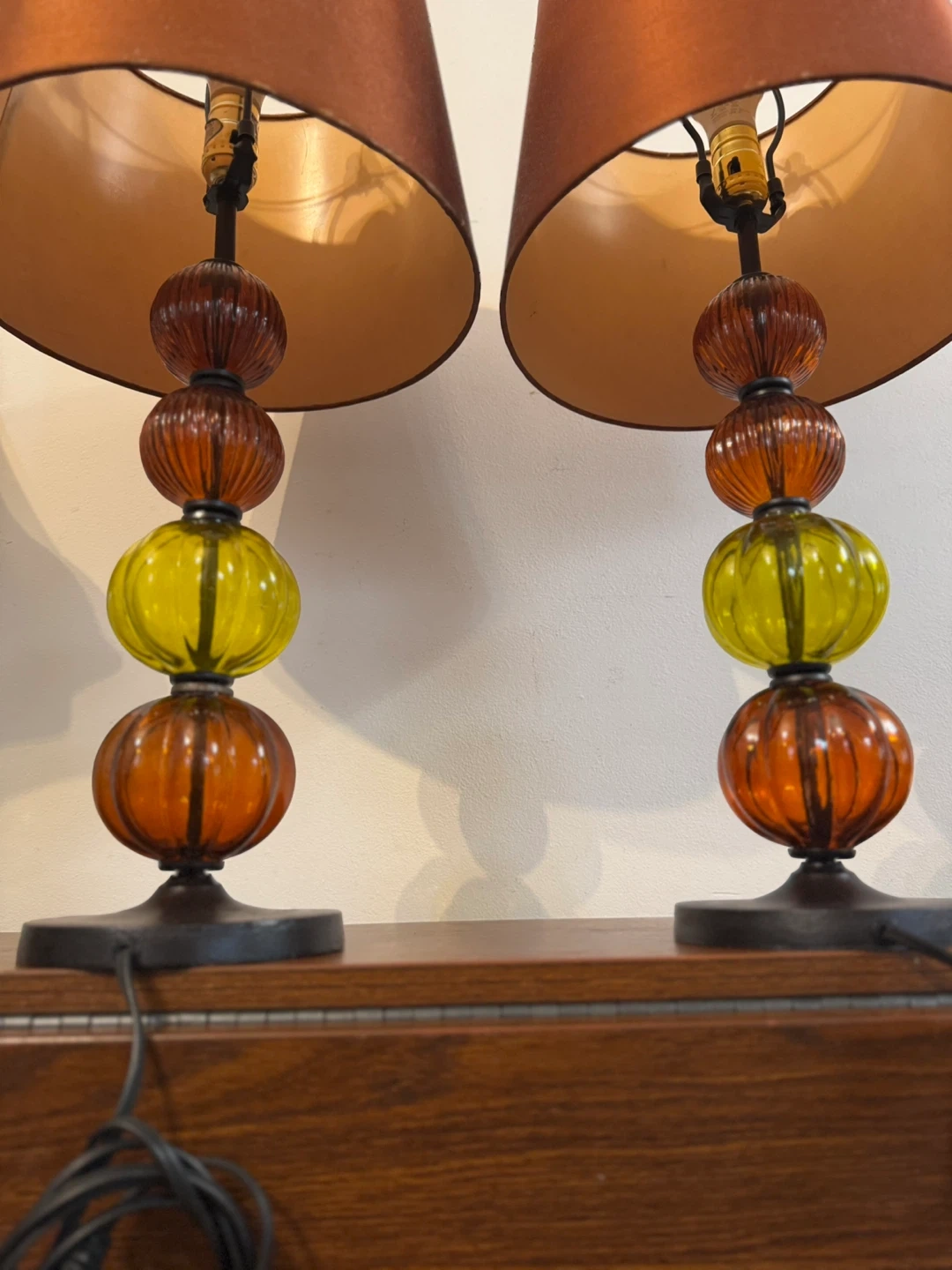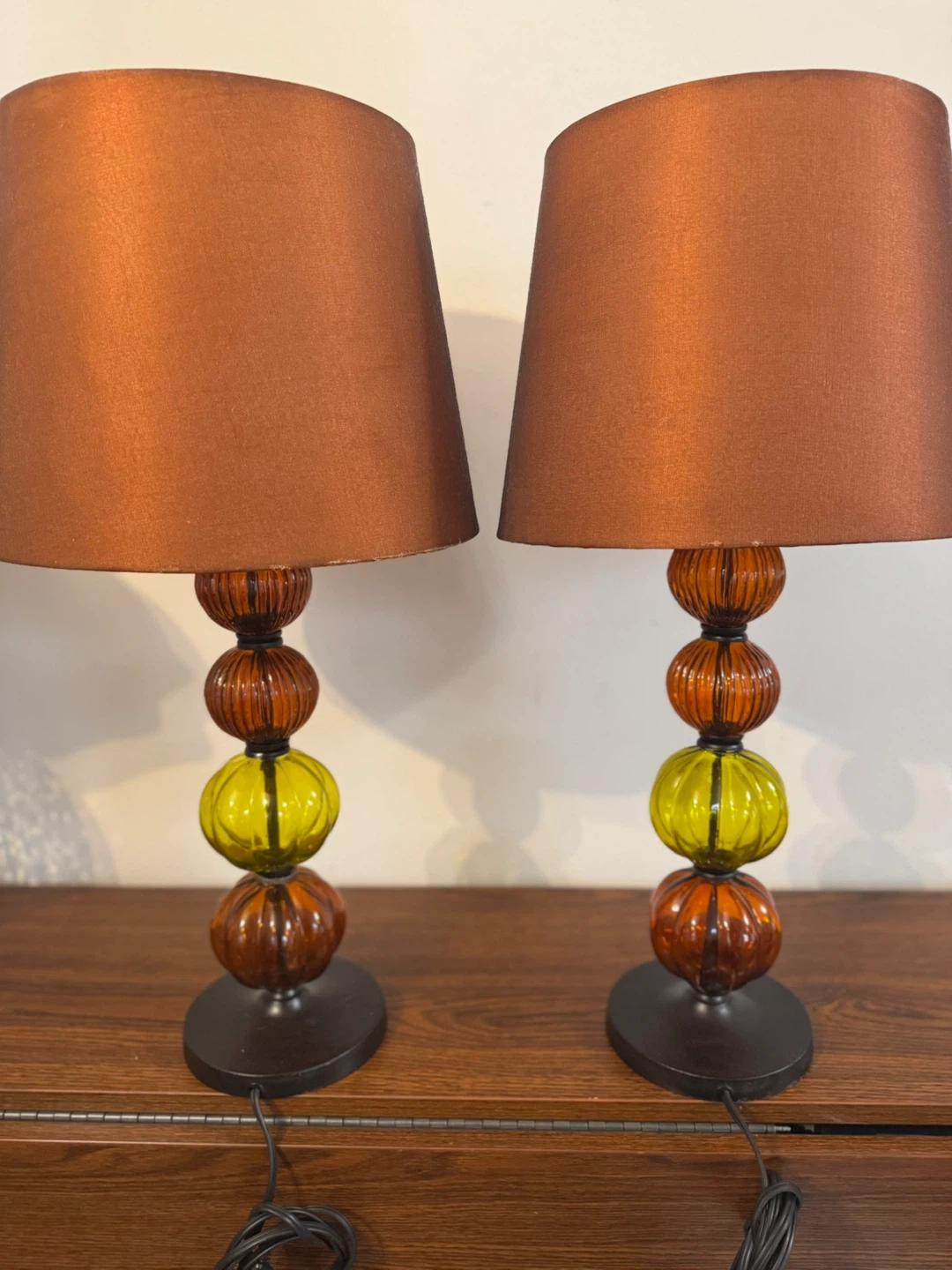 Selling a pair of table lamps. They feature a unique design with stacked spheres in brown and yellow tones, topped with a brown shade. These lamps would add a warm and stylish touch to any room!