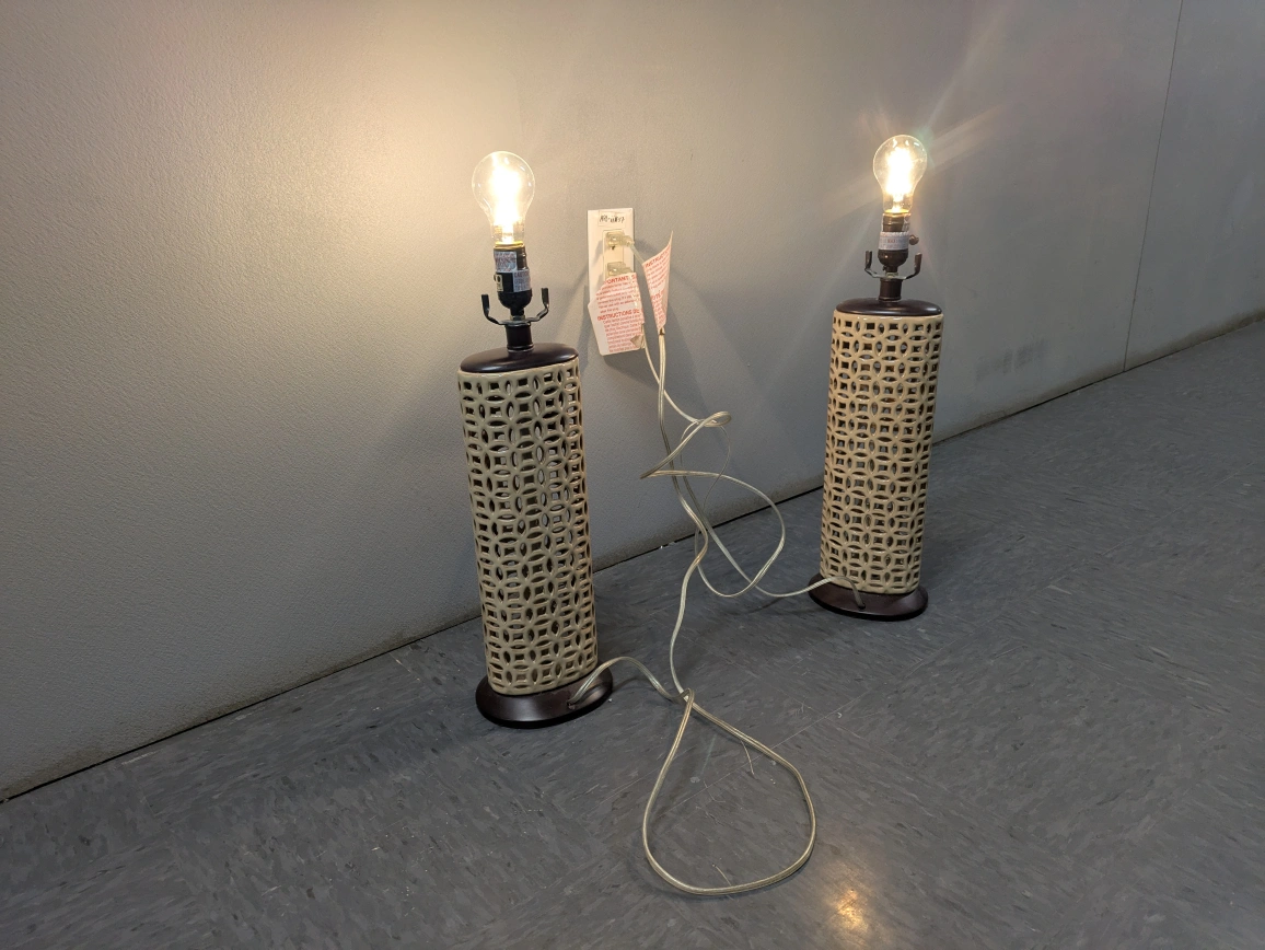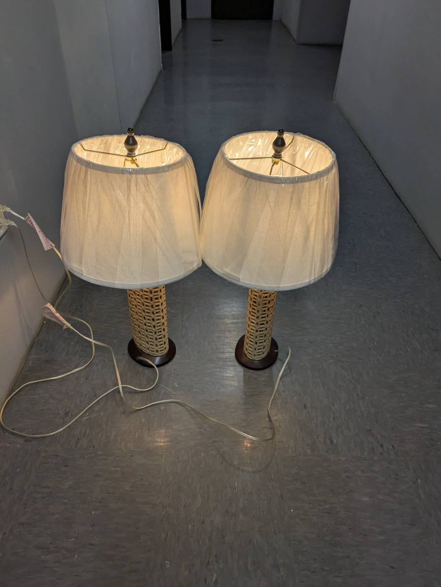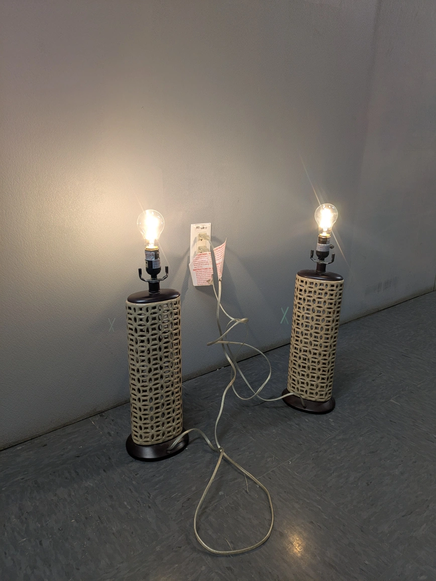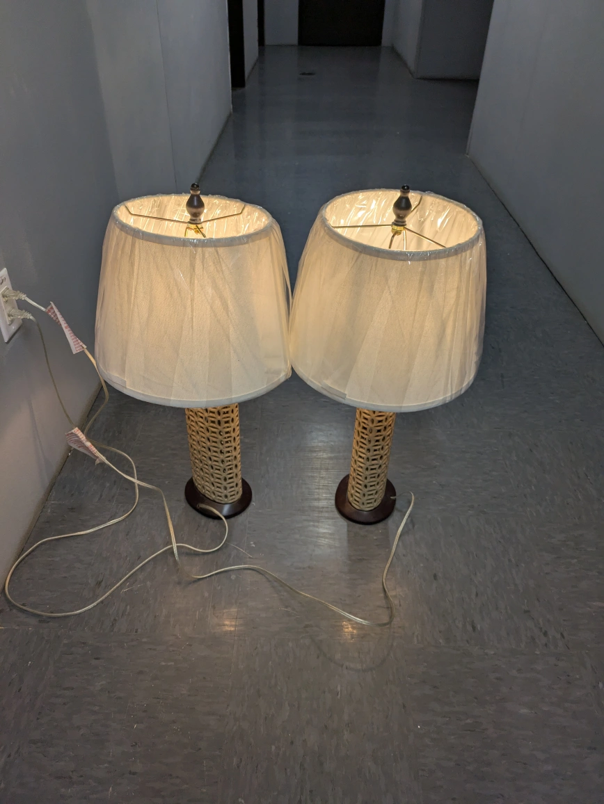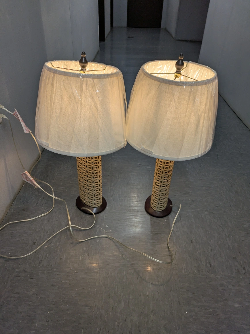 24Set of two table lamps. Beige woven cylindrical bases. Off-white fabric shades. Still in plastic. Bulbs included.