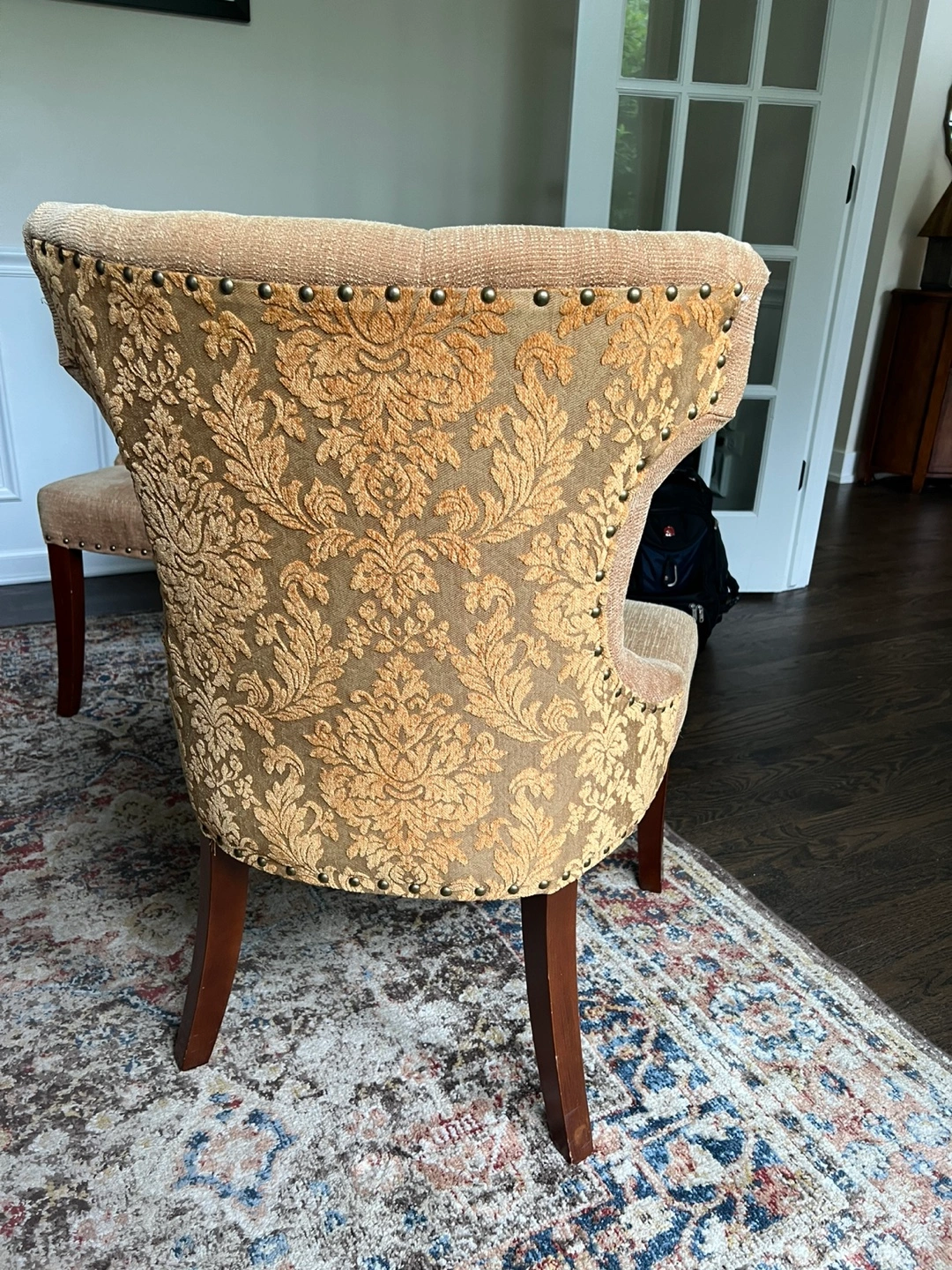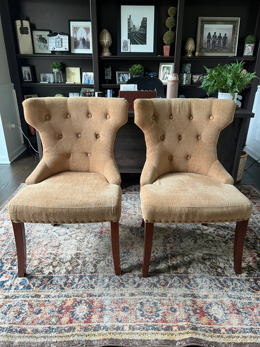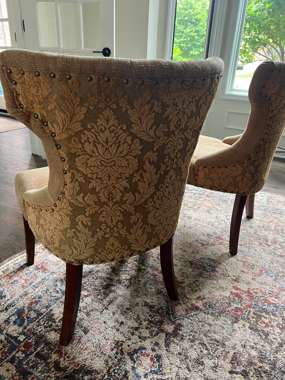 Set of two elegant accent/dining chairs. Beige fabric upholstery. Dark brown wood legs. Button-tufted backs. Nailhead trim. Damask print. Perfect for dining room or living room or office