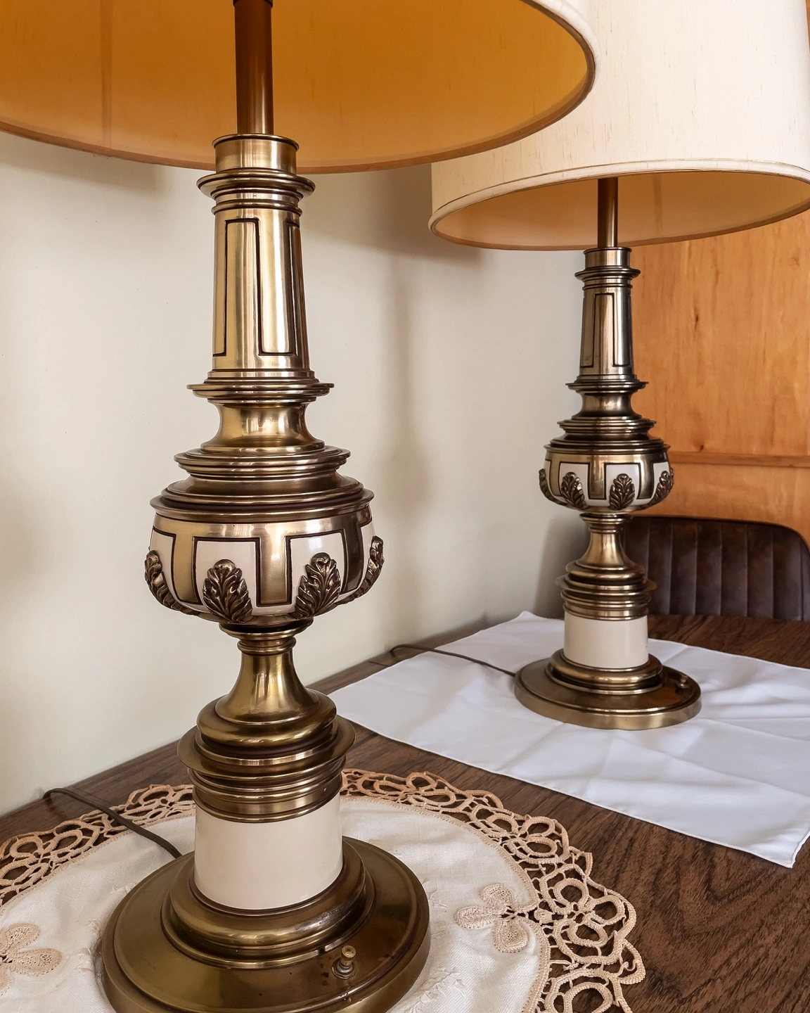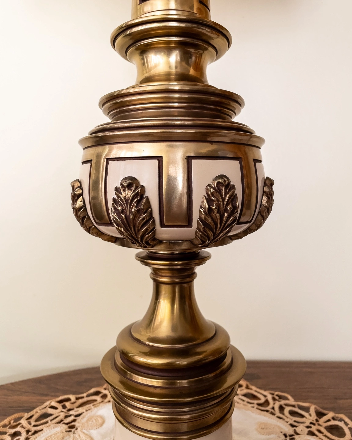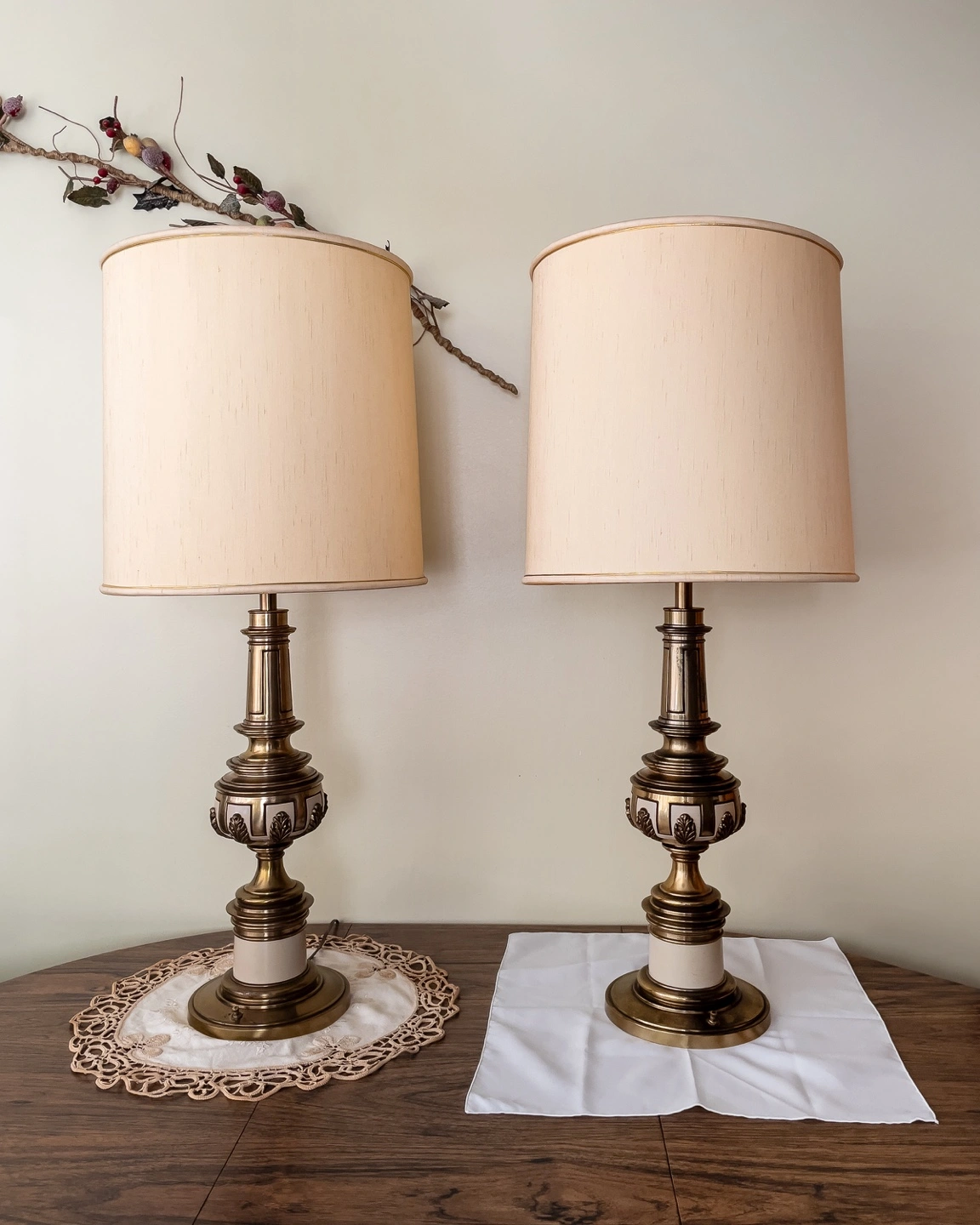 Elegant vintage brass table lamps with cream shades. Measures 40" H with a 15.5" diameter. In good condition with some wear consistent with age and use.