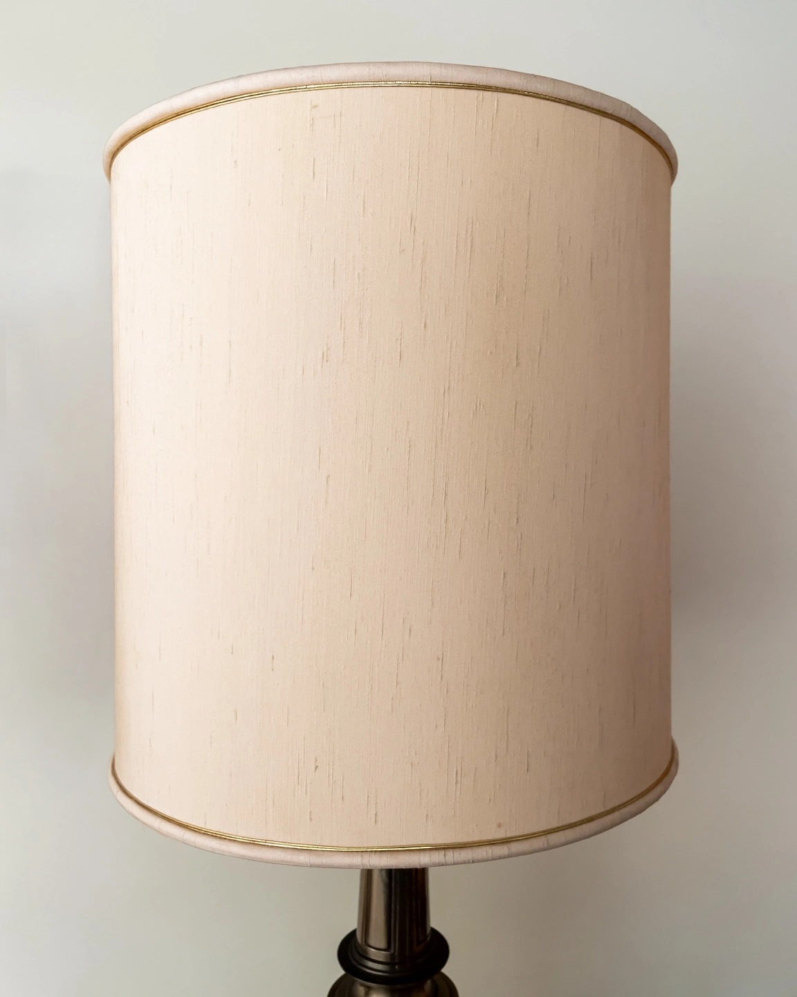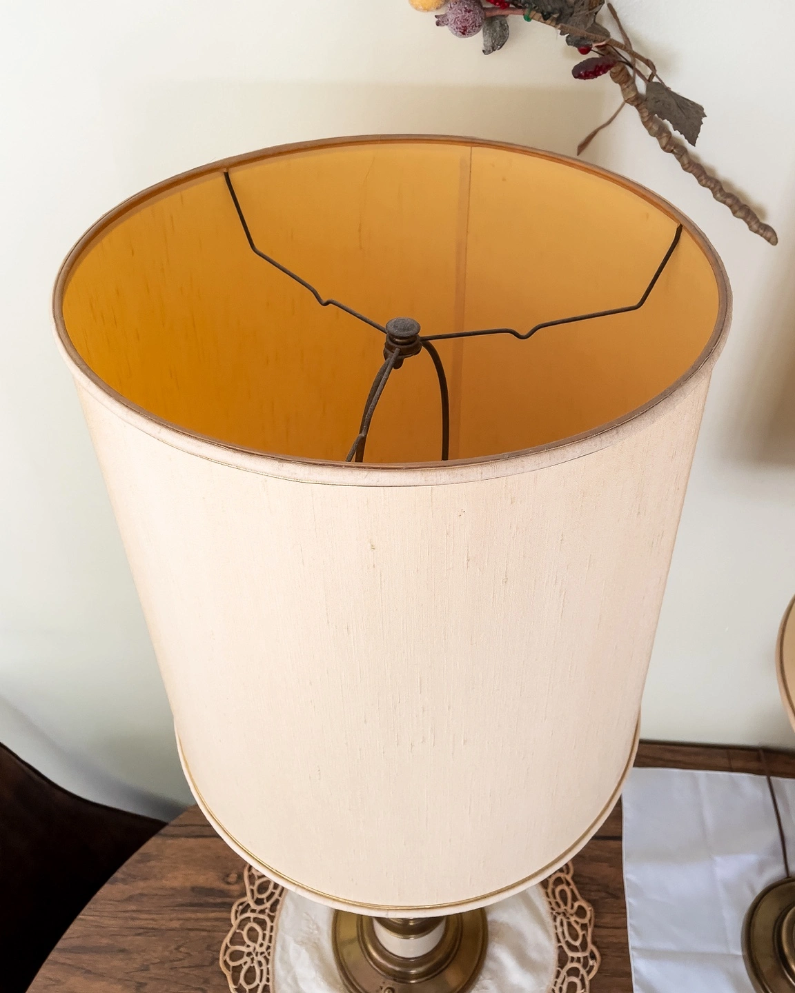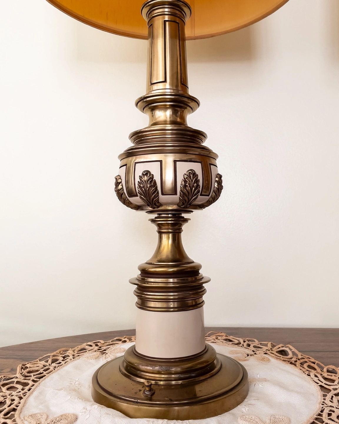 Elegant vintage brass table lamps with cream shades. Measures 40" H with a 15.5" diameter. In good condition with some wear consistent with age and use.