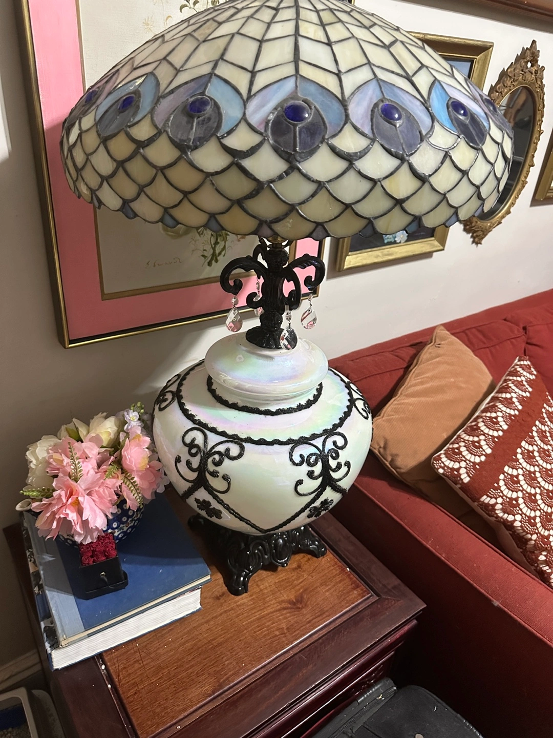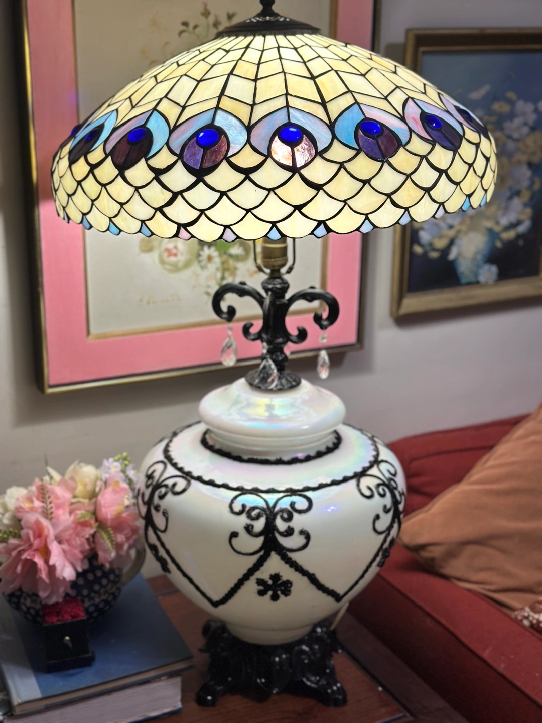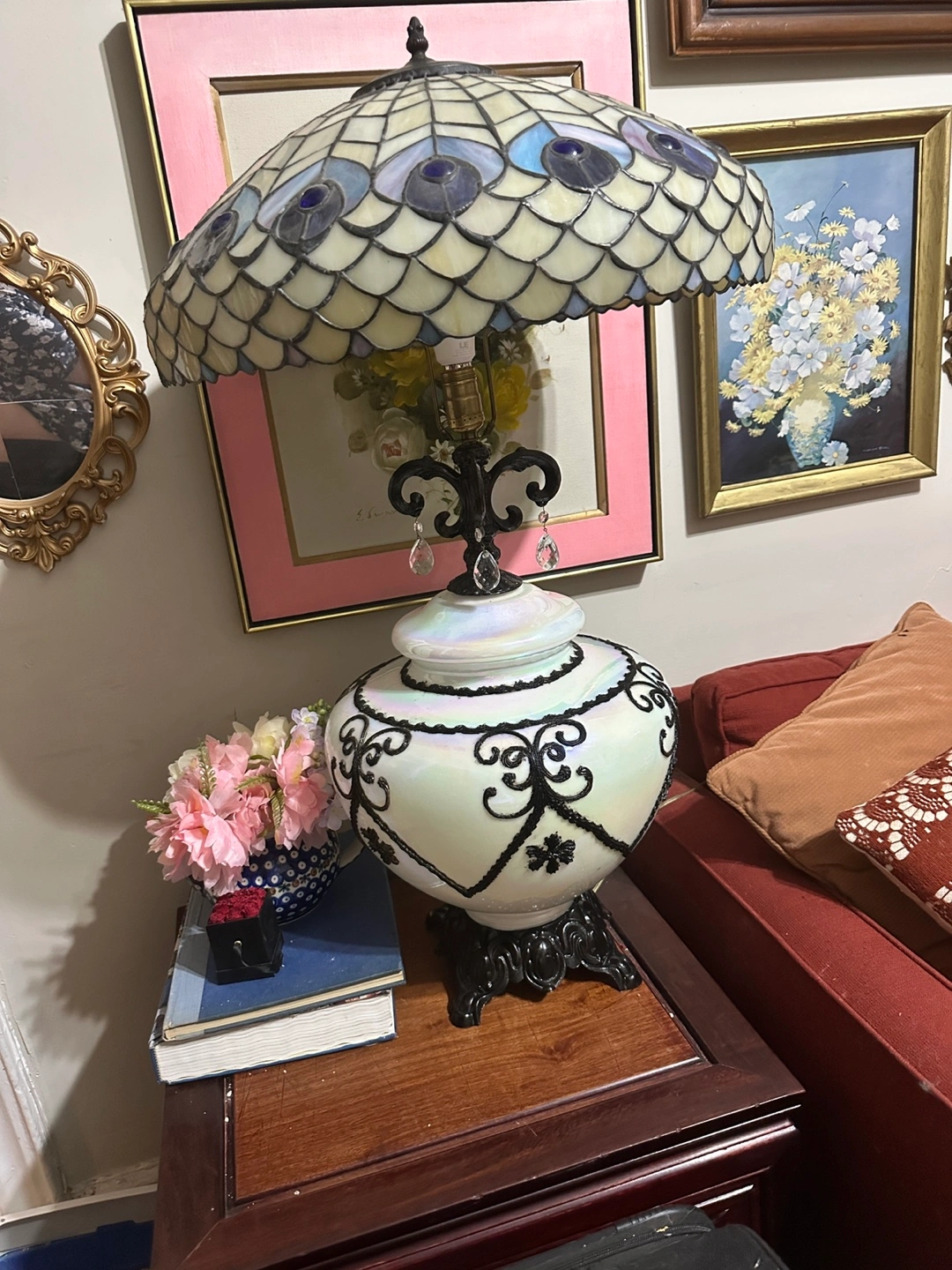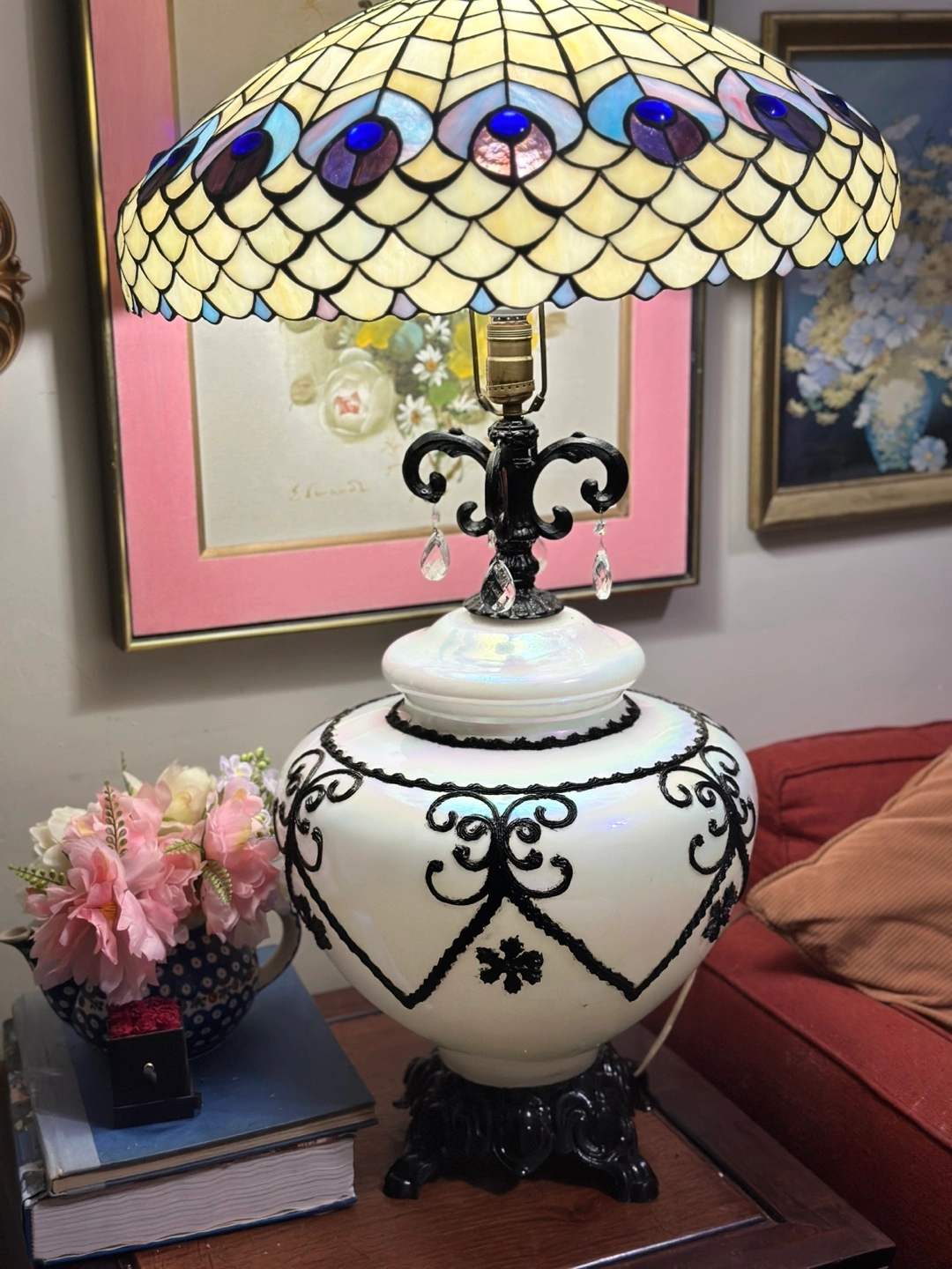 Black and pearlescent white Hollywood regency lamps newly retired. A single lamp for 100 or both available for sale without shades for 175 second lamp has had repairs to the decorative scrollwork arms at the top. An iconic designer of the Hollywood regency style during the 30’s and 40’s Carl Falkenstein’s designs often featured starkly contrasting colors like this pearlescent white with an almost iridescent quality, overlaid with decorative scrollwork and floral decoration. This particular lamp was produced by the Accurate Casting Company and, if not designed by Falkenstein directly, it was most certainly derivative of his iconic style. Sold without shades. Free pickup in Flatbush or local nyc delivery available for $30 per lamp.