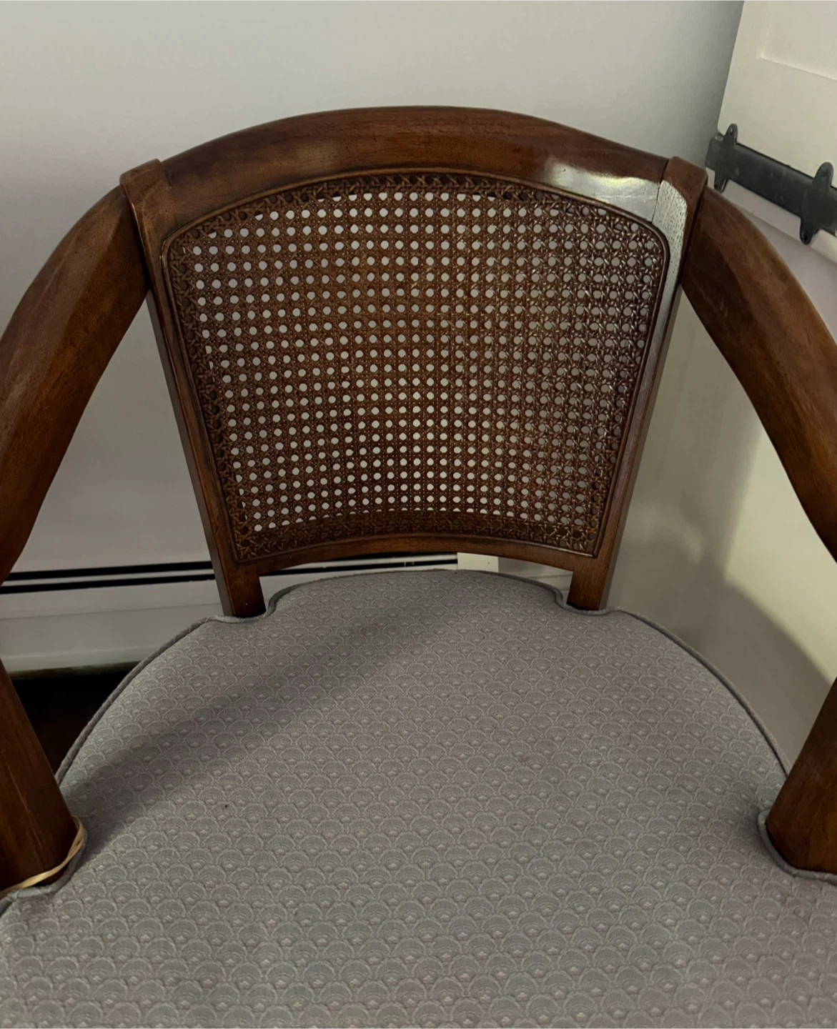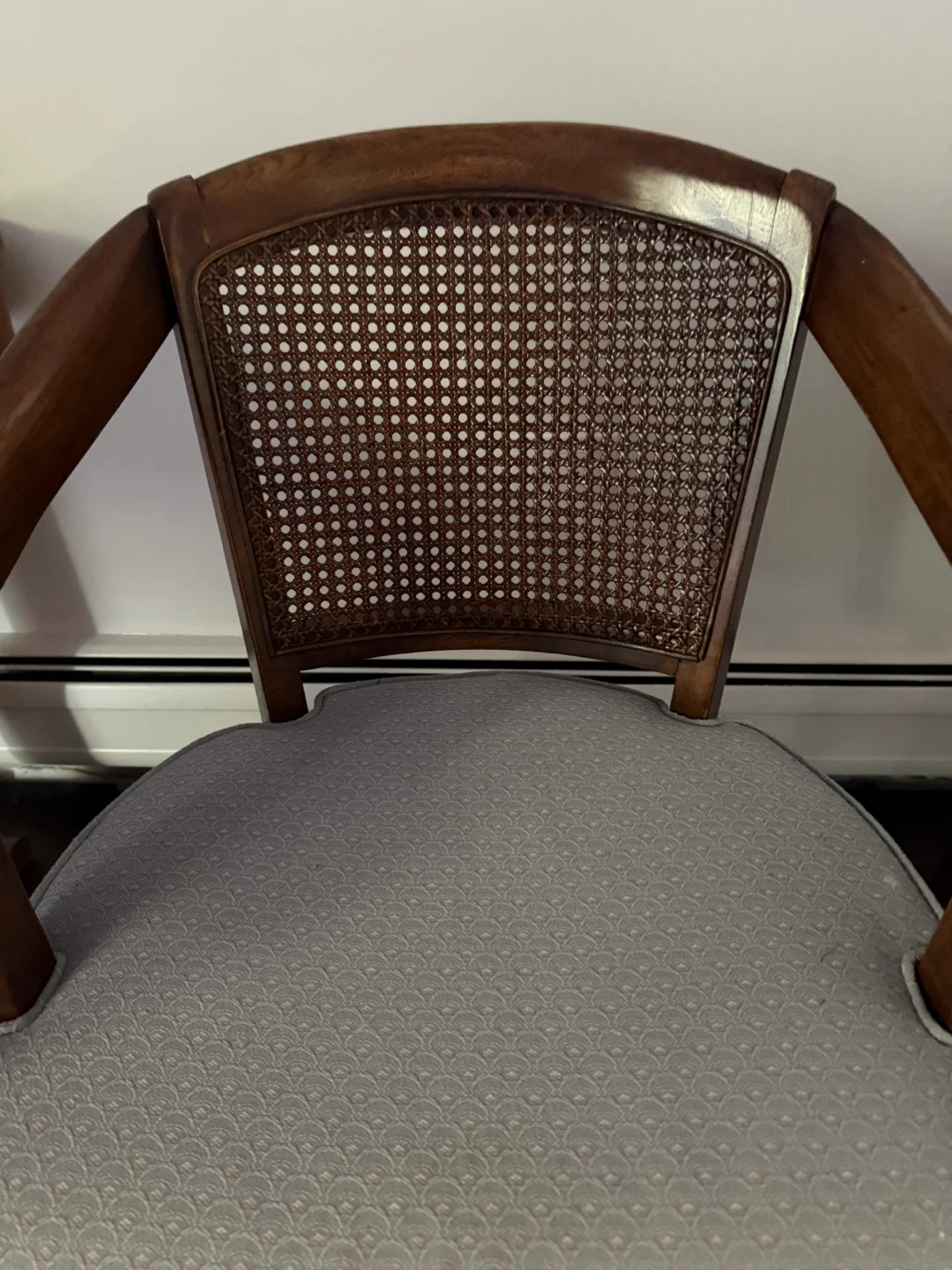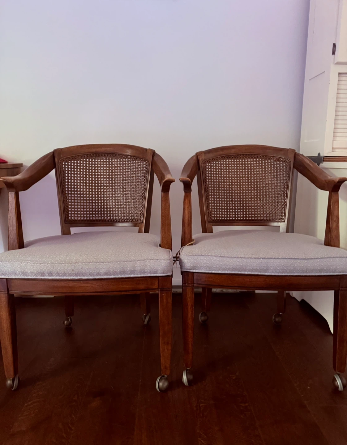 10Selling a pair of vintage wooden armchairs! They feature cane backs and a neutral-toned patterned fabric seat. These chairs have a classic and timeless design, perfect for adding a touch of elegance to any room. They are on castors and in great condition.