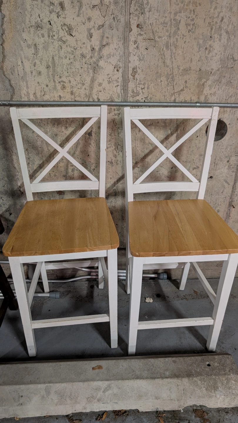 Two white and light brown wood kitchen stools. X-back design. Simple and modern style. Originally purchased for $110. Might be able to help transport in lower Brooklyn.