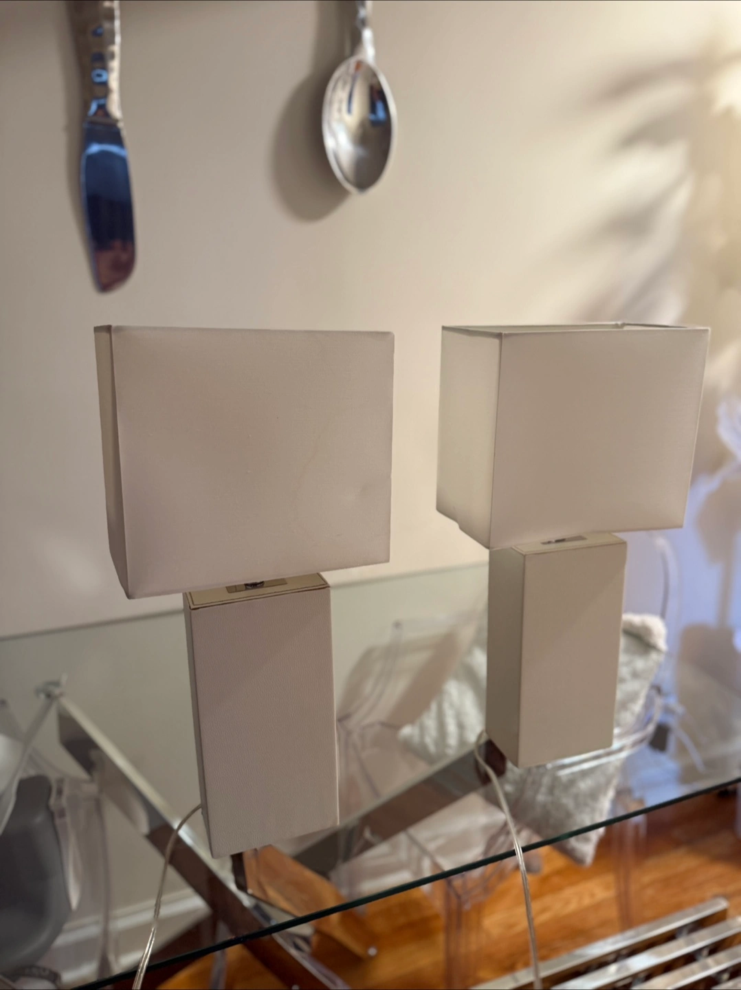 Selling a pair of stylish white square lamps! They're in good condition with a stain on one of the lamps (as seen of photo). Would look perfect on bedside tables or in a living room. The square design adds a modern touch to any space. Base is made out of a faux leather material easy to clean.