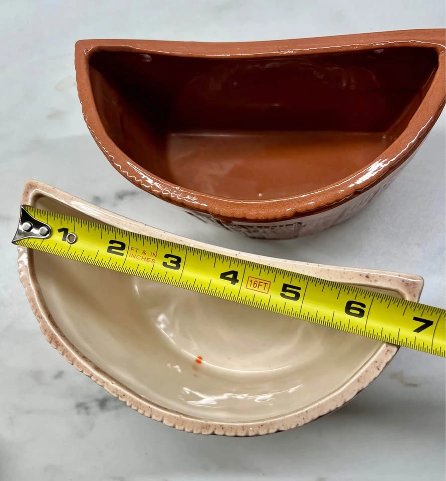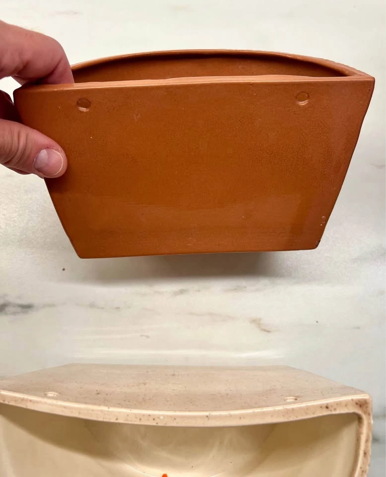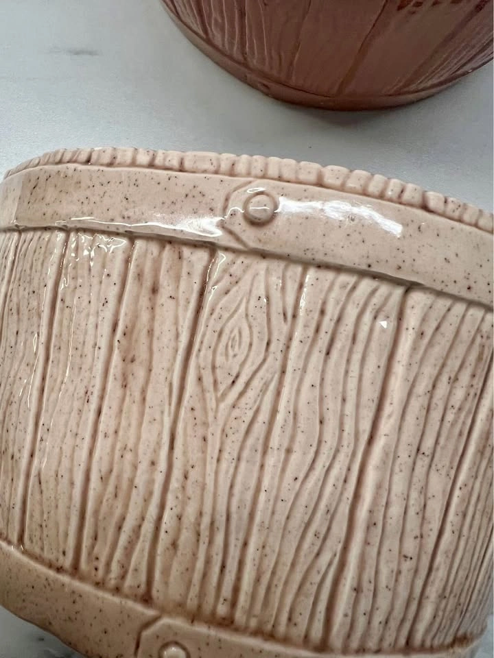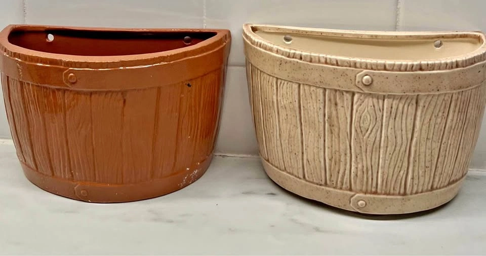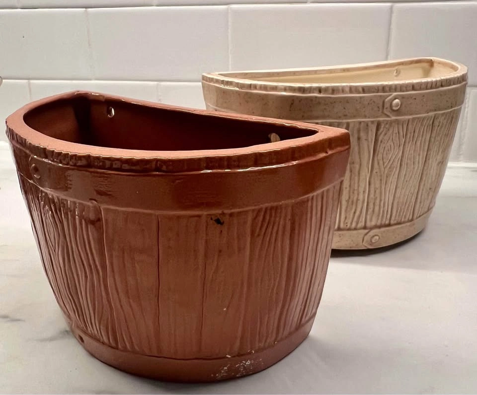 60PICK-UP ONLY NYC - No Shipping Vintage MCM Pair of Wall Pocket “Buckets”, Faux Woodgrain Ceramic Each has 2 original holes on its flat edge for hanging No cracks, scuffs. Perfect for plants, pens, utensils or just a decor :)