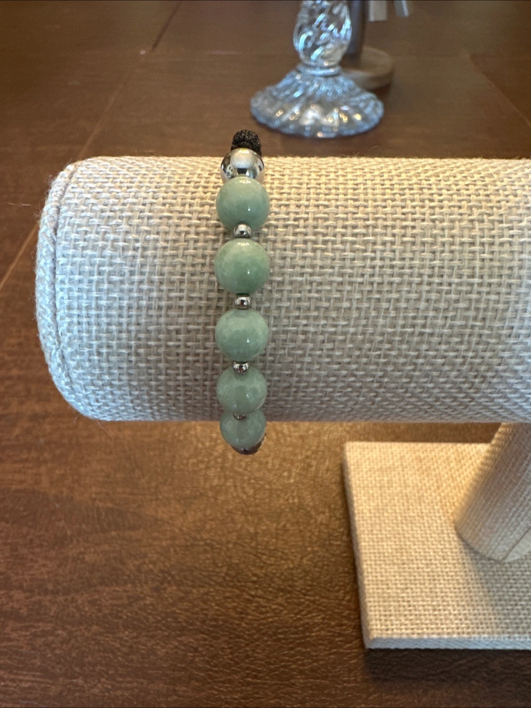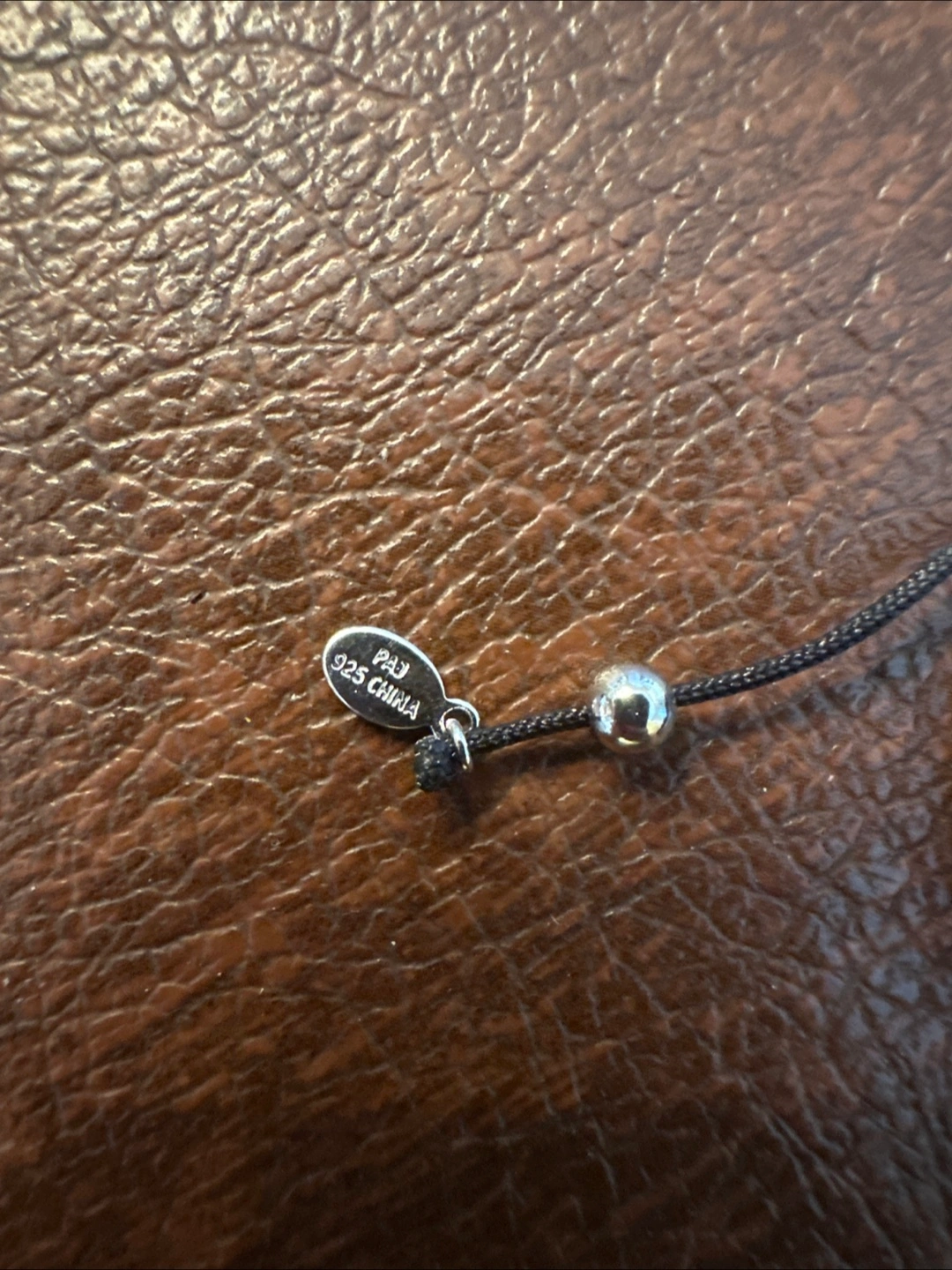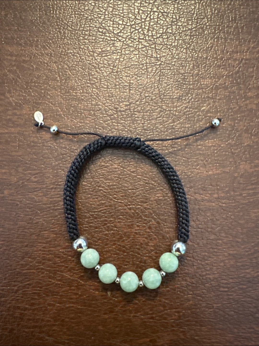 Selling a cute jade bead bracelet! It has a black braided cord and silver accents. The clasp is marked 'PAJ 925 CHINA'.