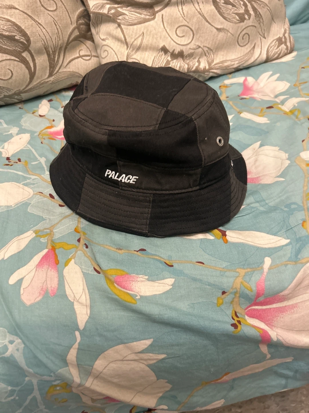 Selling a Palace bucket hat in black. It's in great condition and ready for a new owner! The hat features a stylish patchwork design. Available for pick up only