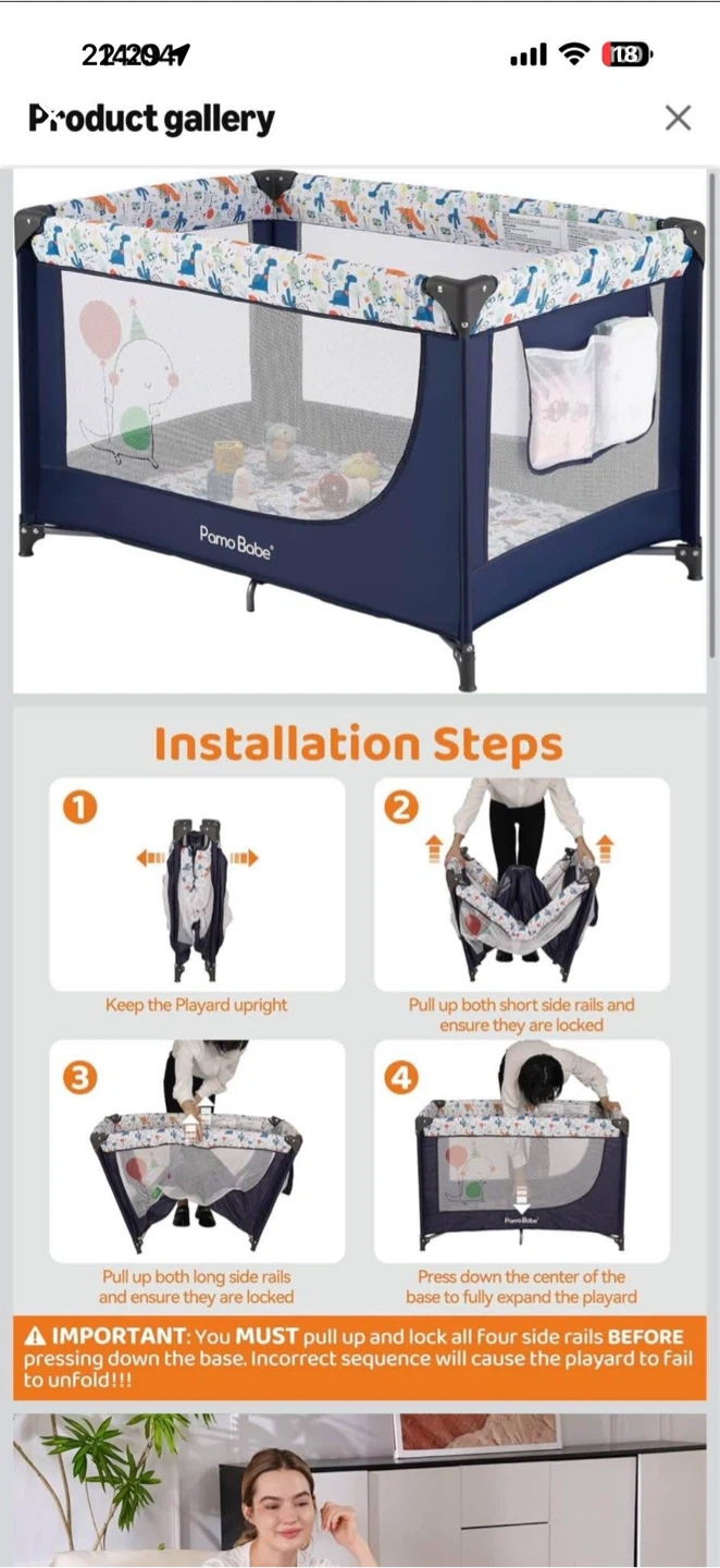 Selling a Pamo Babe playard! It's a portable crib that's easy to set up and take down. The playard features a cute design and includes installation steps printed on the side. Perfect for travel or keeping your little one safe at home