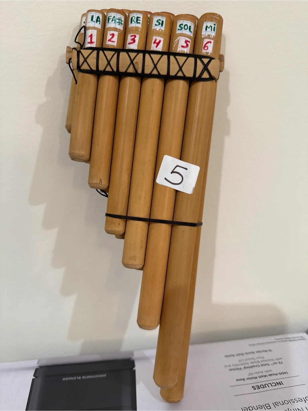 Selling a used pan flute, a traditional folk instrument! It has 6 pipes labeled with musical notes (LA, FA#, RE, SI, SOL, MI) and numbered 1-6. Great for someone interested in learning a unique instrument