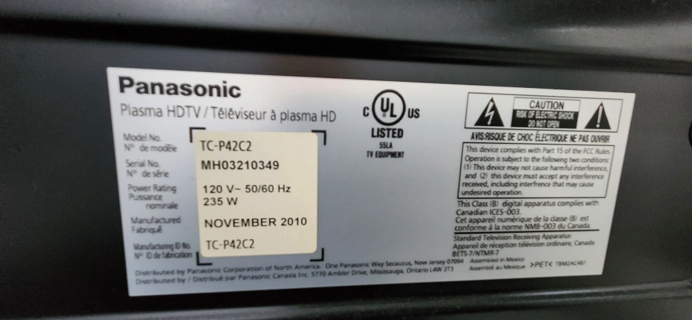 42 inch Panasonic plasma HDTV. Includes remote. Model number TC-P42C2. -Multiple Inputs -SD port for viewing files and pictures