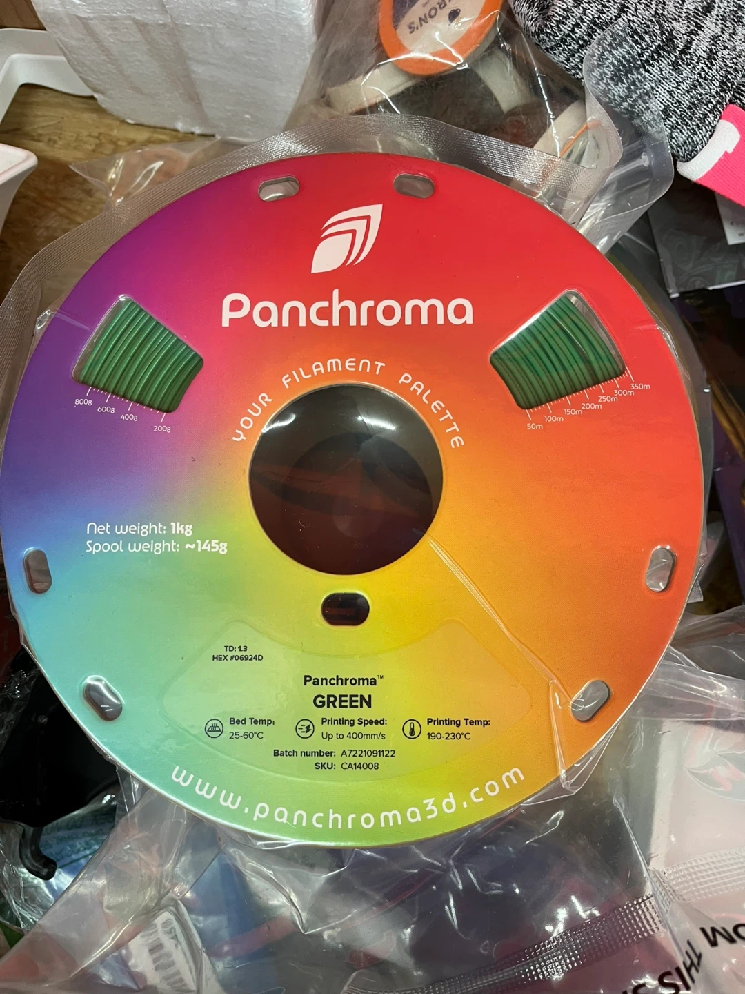 Selling a spool of Panchroma Green Filament for 3D printers! It has a net weight of 1kg and a spool weight of about 145g. Recommended bed temperature is 25-60°C, printing speed up to 400mm/s, and printing temperature between 190-230°C