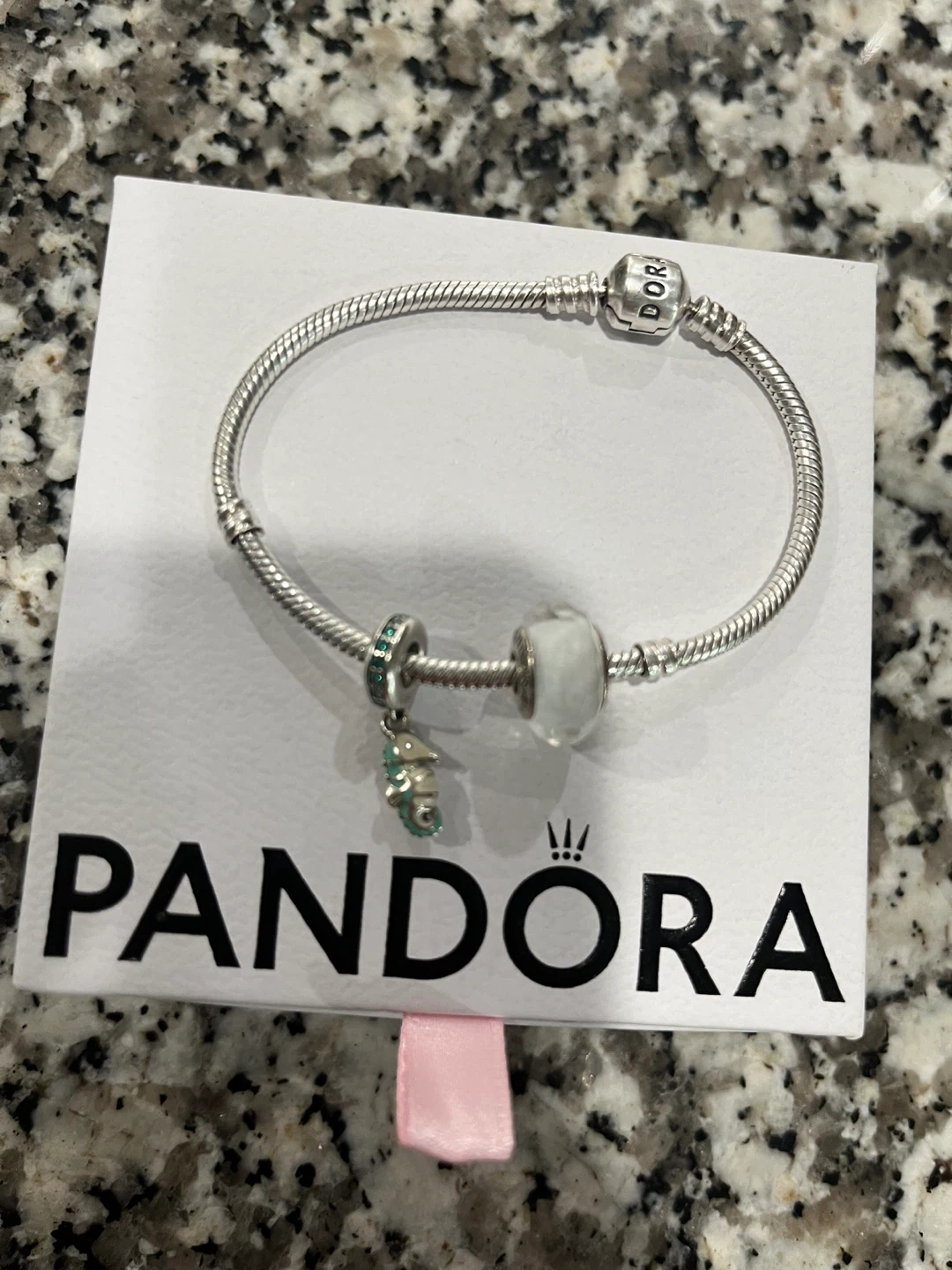 Selling a Pandora charm bracelet. It is in great condition and comes with the box! The bracelet has a seahorse charm and a white bead charm.