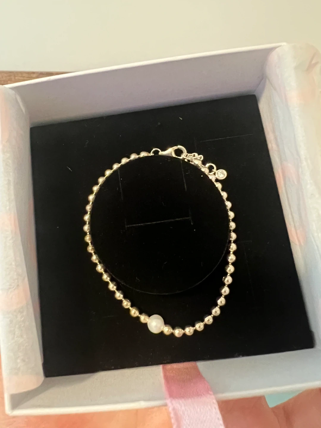 Selling a beautiful Pandora silver beaded bracelet featuring a single pearl. It comes with its original box and looks great on its own or stacked with other bracelets!
