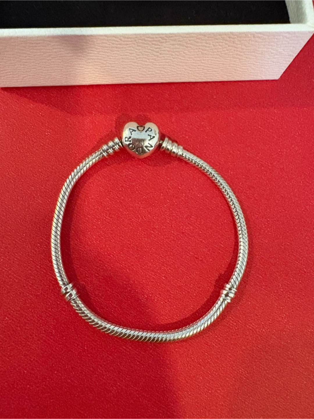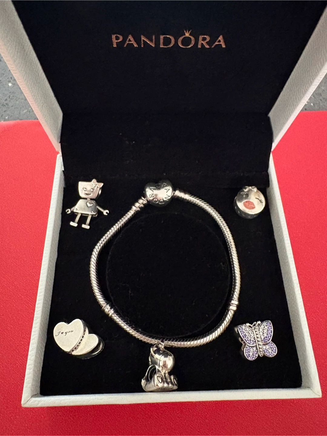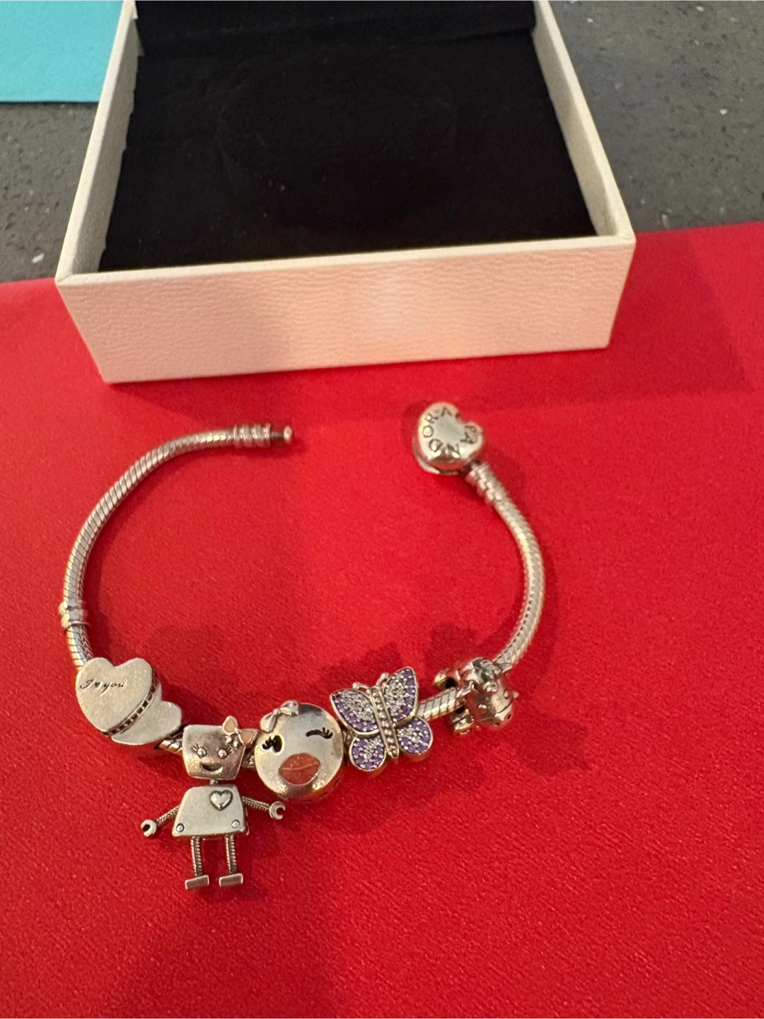 Selling a beautiful Pandora silver charm bracelet! It comes with several charms, including a heart, a butterfly with purple stones, and other adorable designs. The bracelet comes with its original box, perfect for gifting or safekeeping