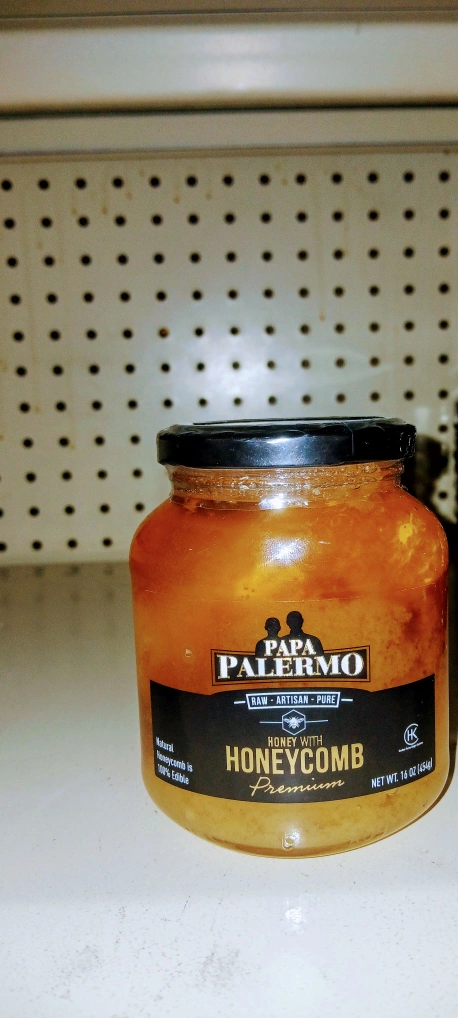 Selling a jar of Papa Palermo Honey with Honeycomb Premium. It's raw, artisan, and pure. The natural honeycomb is 100% edible and the jar contains 16 oz (454g).