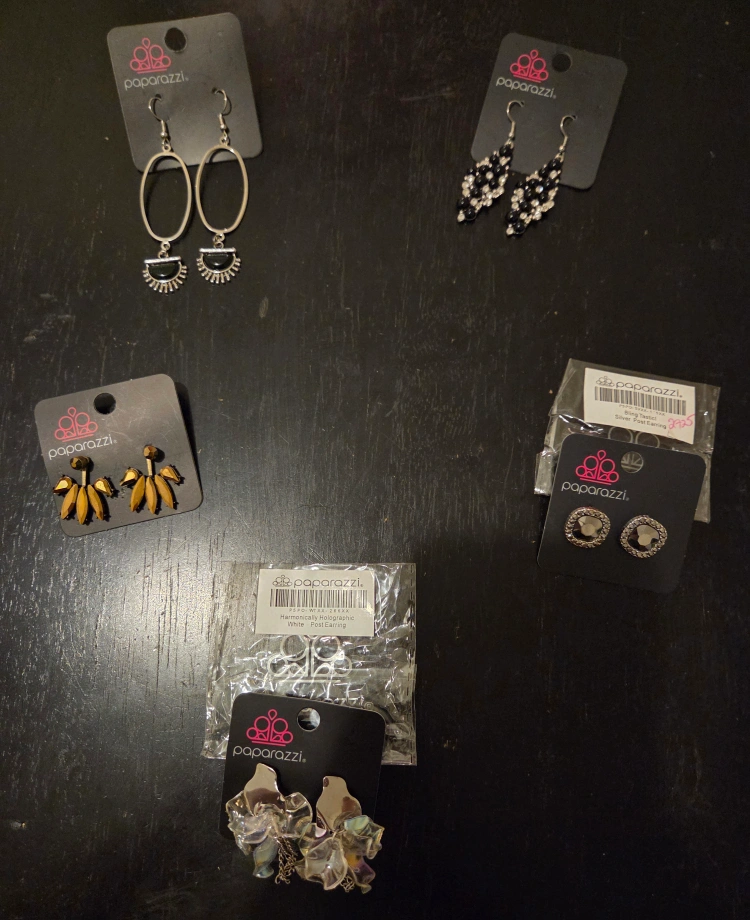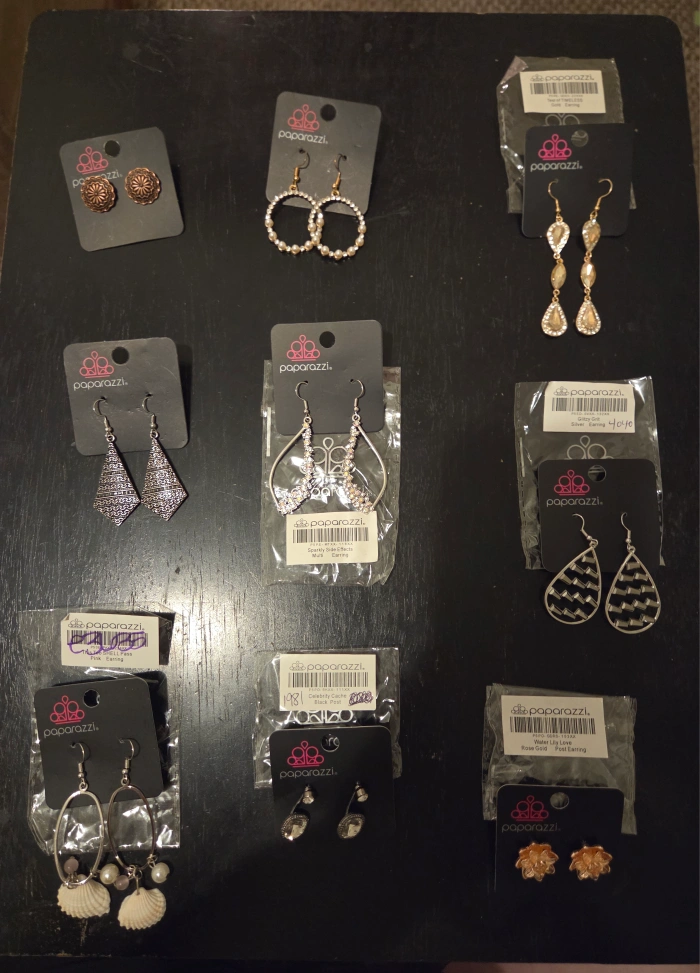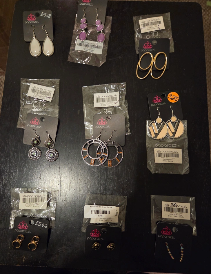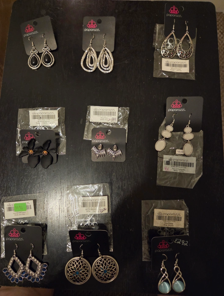 selling a variety of Paparazzi earings assorted styles! All jewelry is brand new and most rings comes in its original packaging, there are somenthat were bought as going out of business pieces that do not have original packaging. These earings are perfect for adding a touch of sparkle to any outfit. Check out the photos to see the different designs available $40 for lot or 1.75 for individual pieces. Will ship for additional cost to buyer.