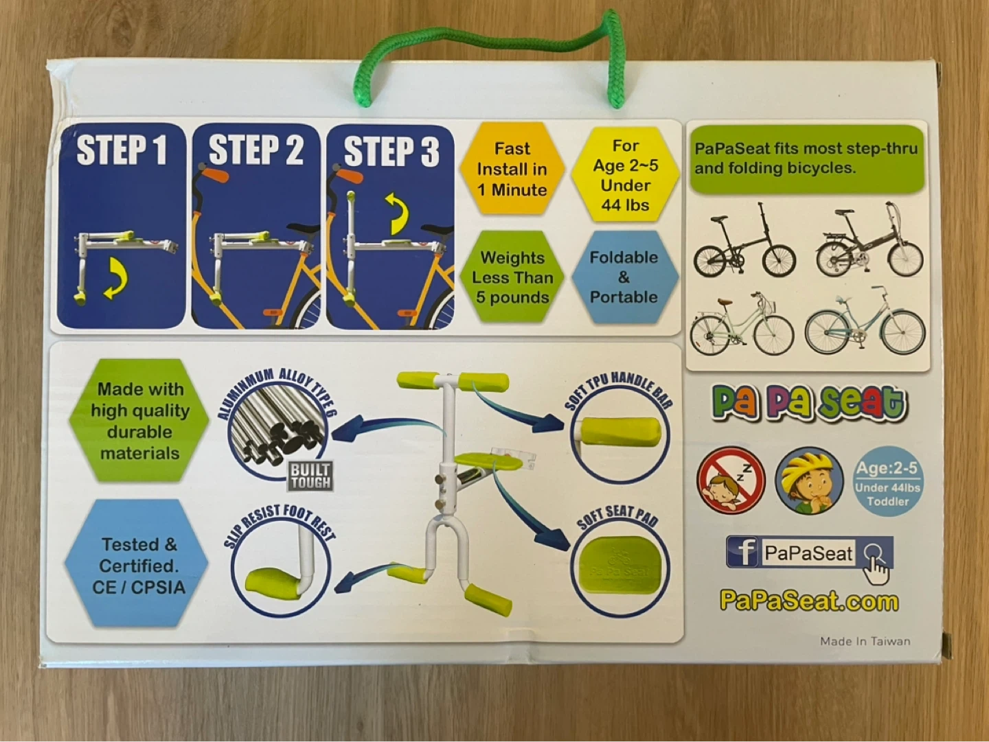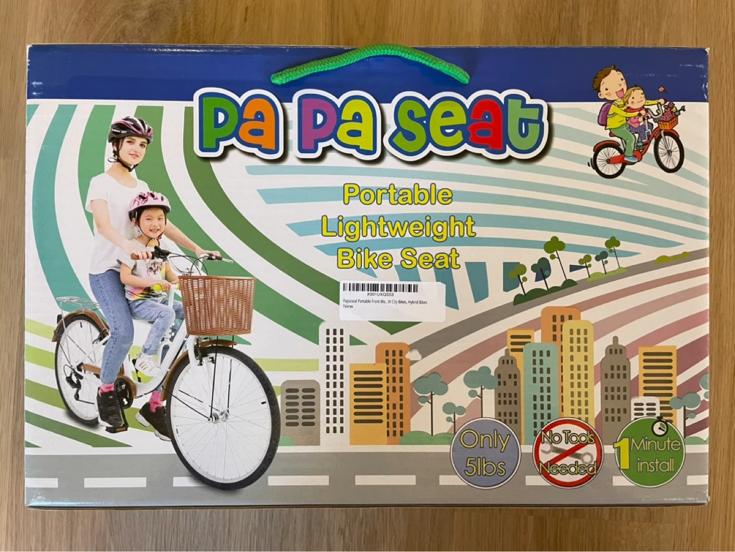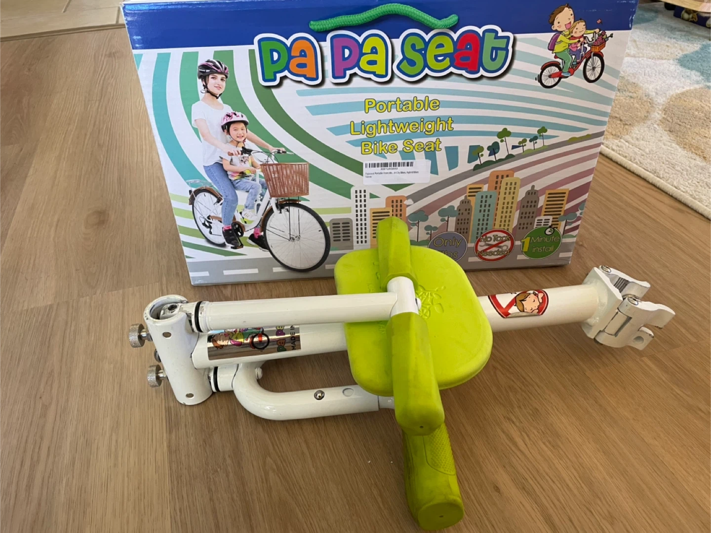 10Selling a PaPaSeat portable lightweight bike seat! It's designed for ages 2-5 and under 44 lbs. It weighs less than 5 pounds and is foldable and portable. It's made with high-quality durable materials and fits most step-thru and folding bicycles. Easy to install in just 1 minute! Box included