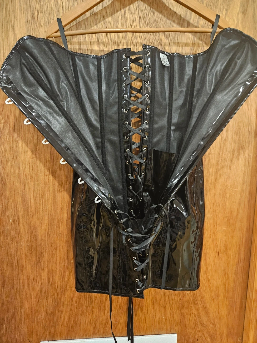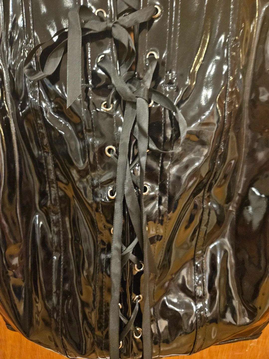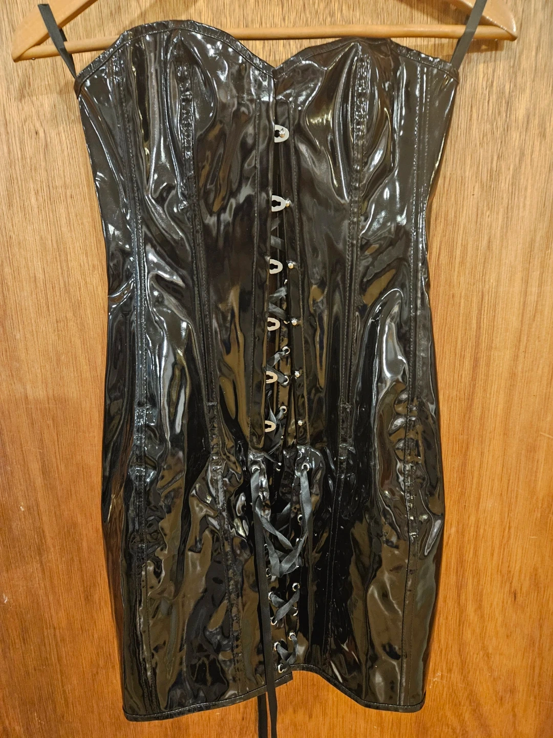 Here's a black corset dress that's sure to turn heads! It features a lace-up front and a shiny, patent-leather-like material. Perfect for a night out or a special occasion