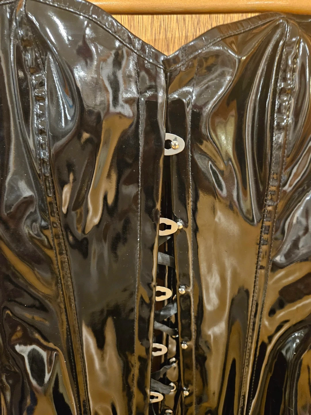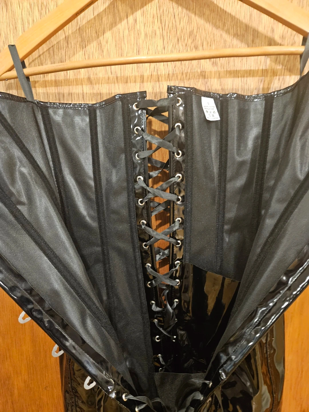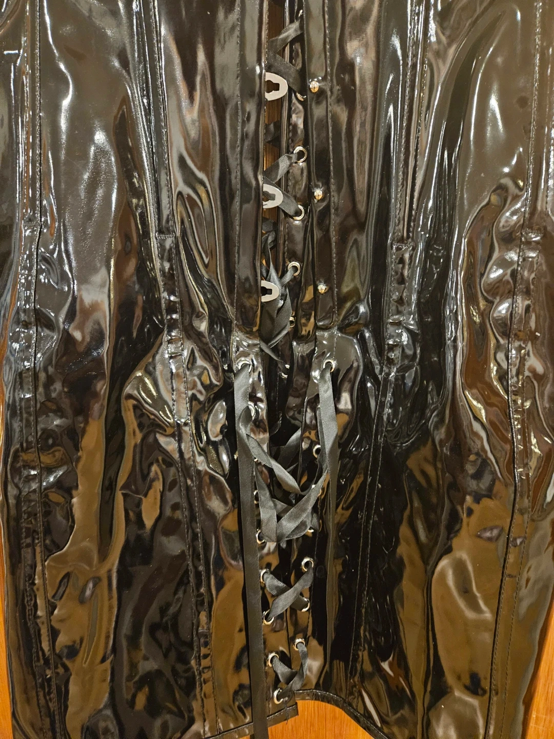 Here's a black corset dress that's sure to turn heads! It features a lace-up front and a shiny, patent-leather-like material. Perfect for a night out or a special occasion
