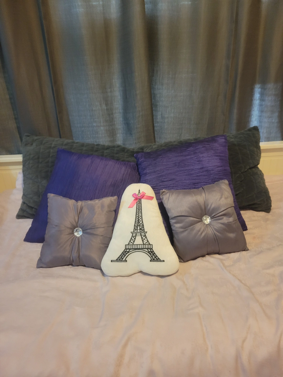 Cute decorative pillow featuring the Eiffel Tower. Soft and plush. Perfect for bedrooms or living rooms. Includes additional throw pillows.