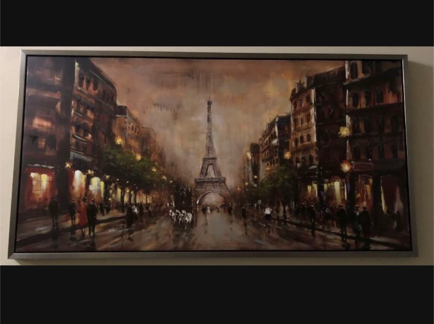 60A beautiful painting of the Eiffel Tower in Paris! The painting features a street scene with the Eiffel Tower in the background. It is framed and ready to hang up in your home It’s 52 in width by 27 inches