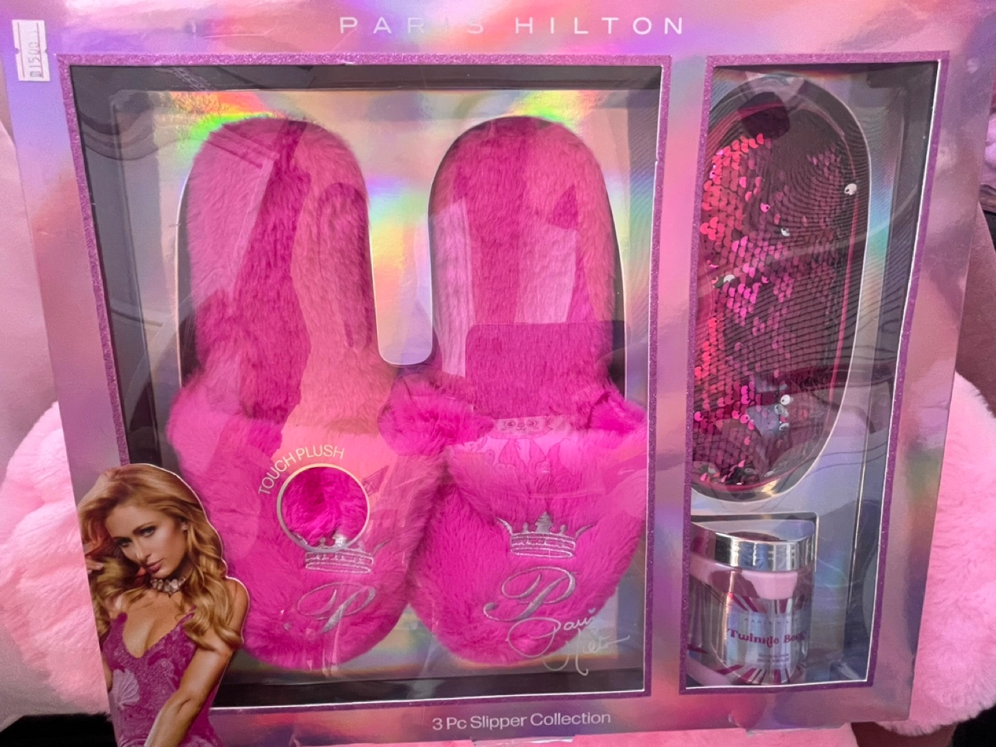 49Pink fuzzy slippers, sequined eye mask, and body cream. Brand new in box.