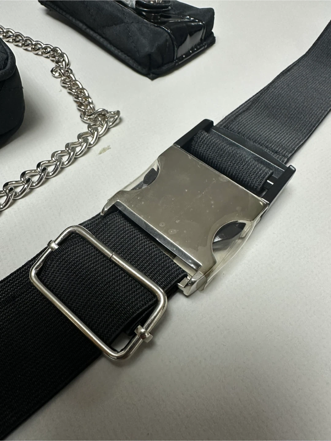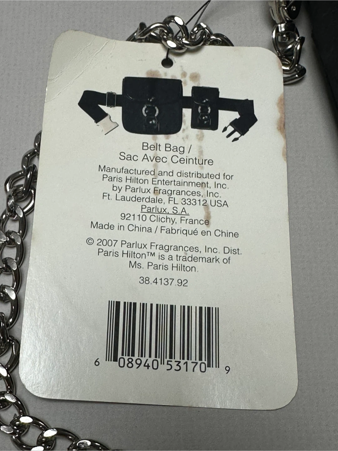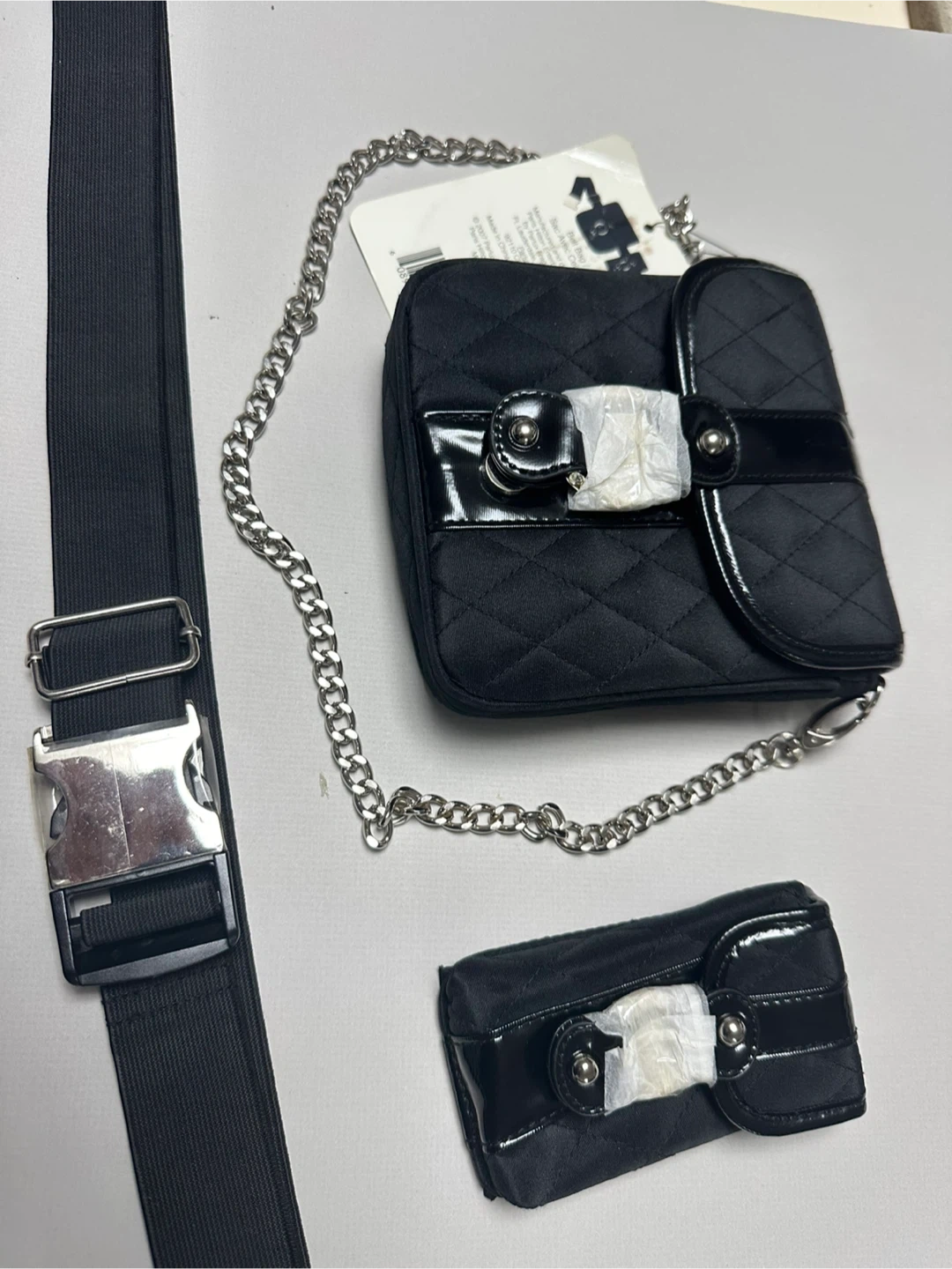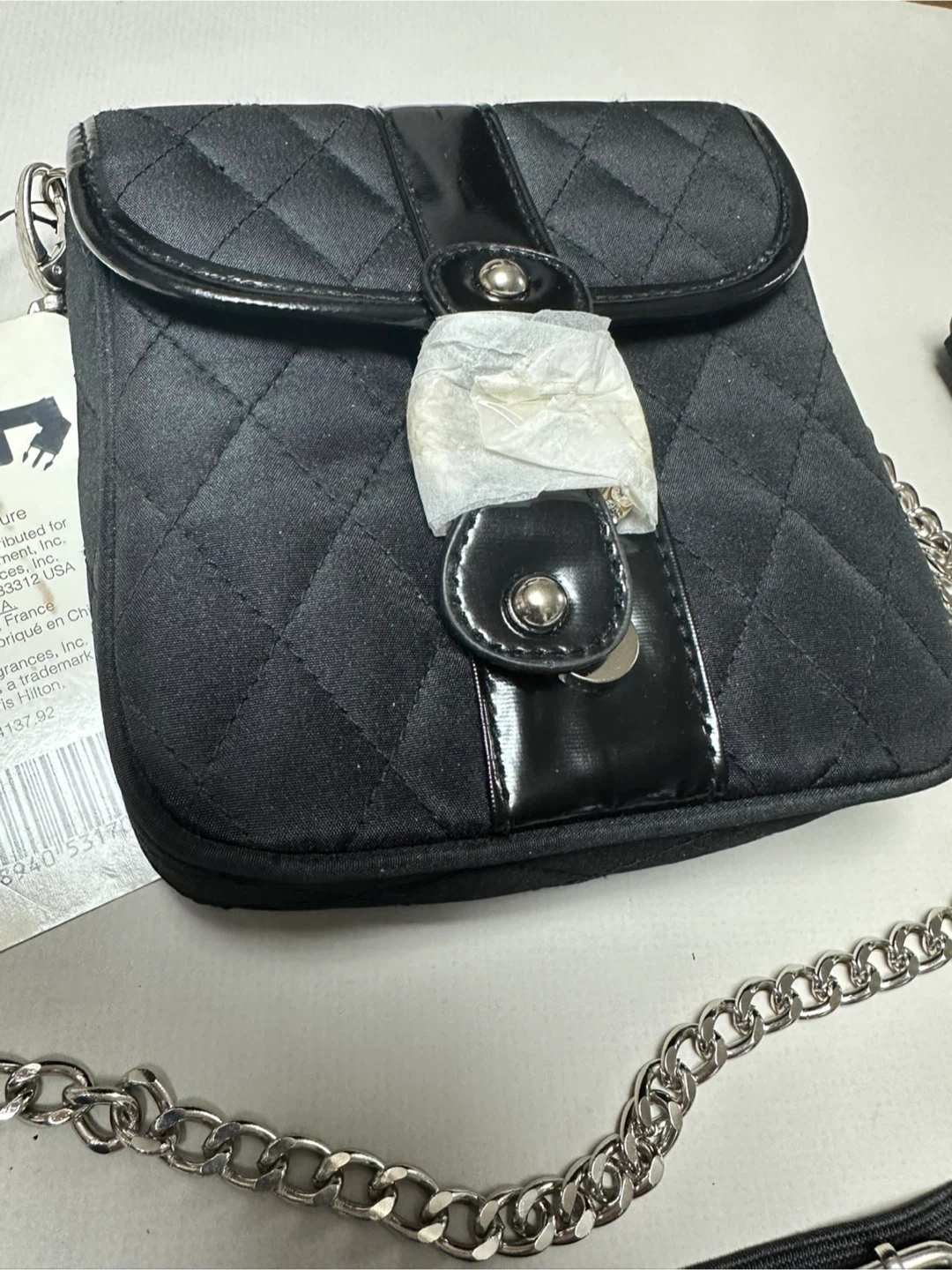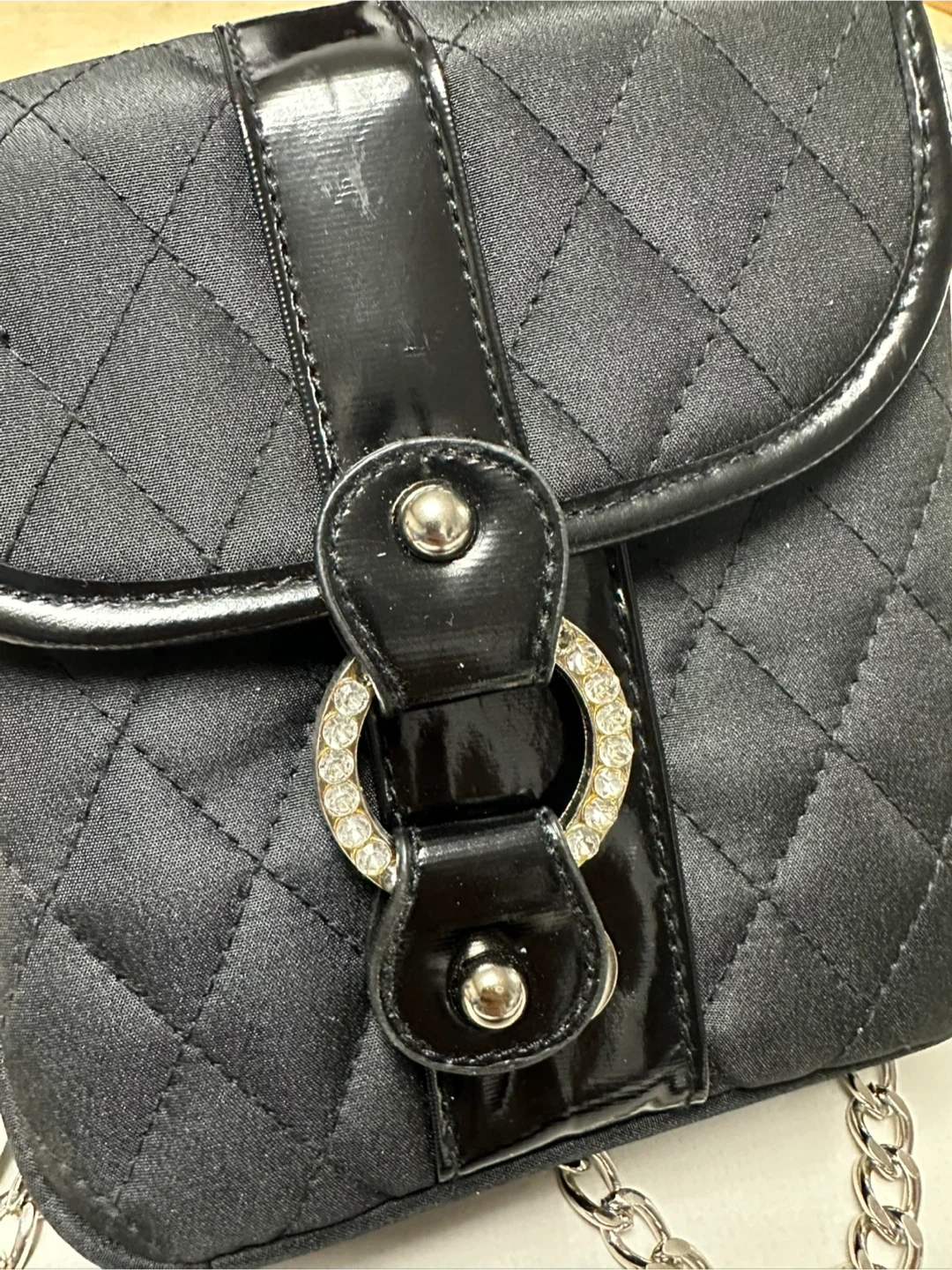 This is a cute black quilted crossbody bag from Paris Hilton. It features a chain strap and a shiny black accent. It also comes with an additional strap and a smaller pouch.