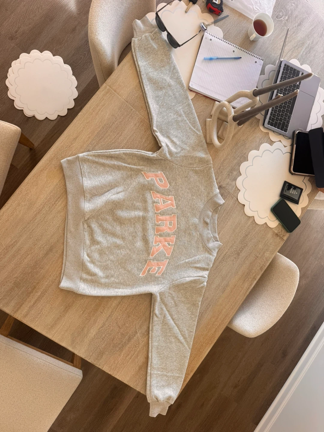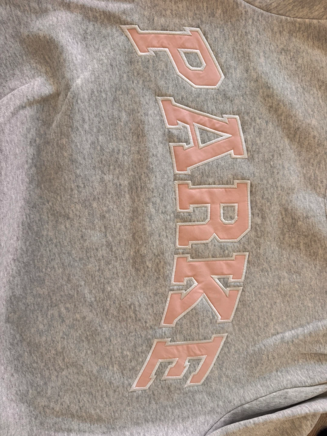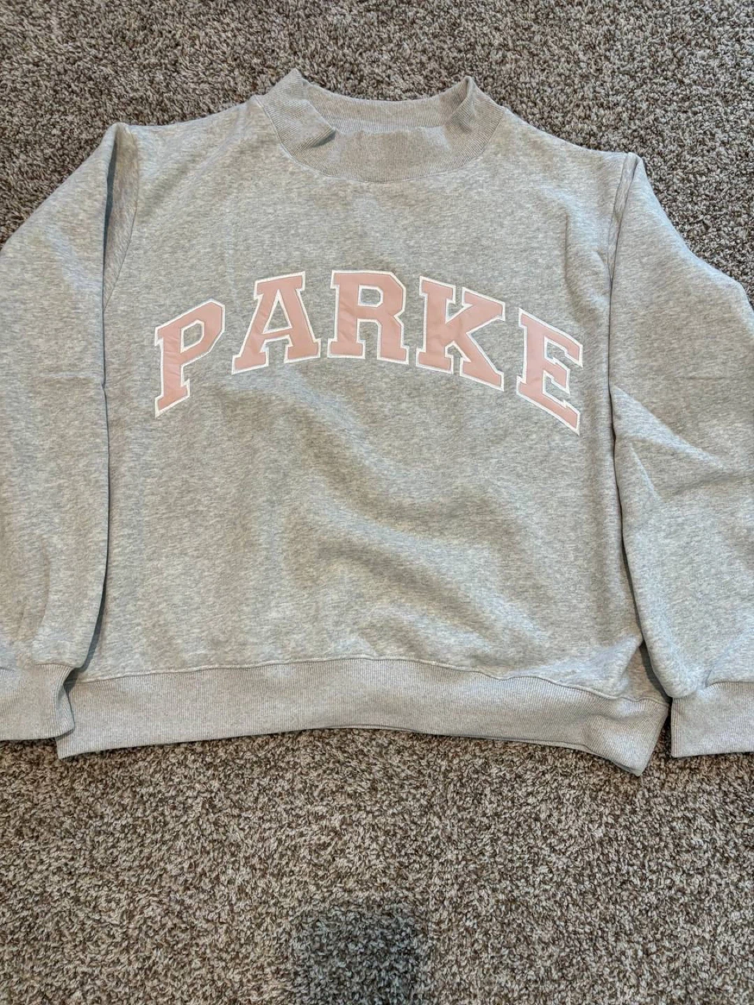 10Selling a PARKE sweatshirt in size L/XL! It's a light gray color with the brand name in pink letters. It's in great condition and ready for a new home