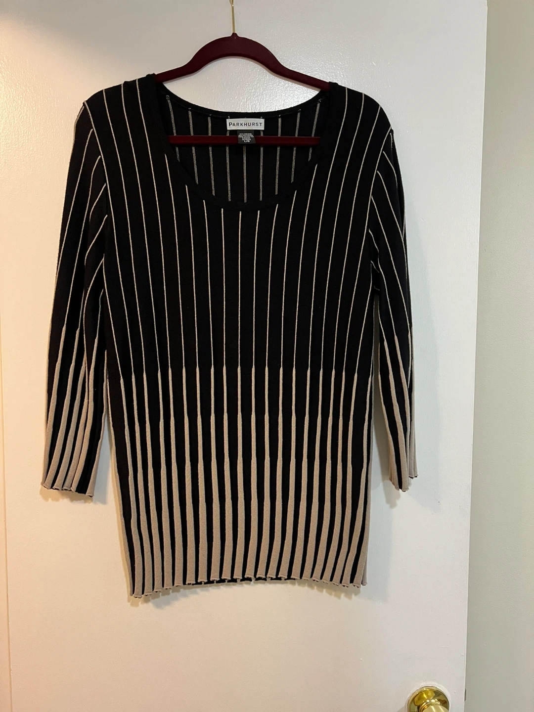 257Selling a Parkhurst sweater in size Large! It features a black and beige striped pattern and has 3/4 sleeves.