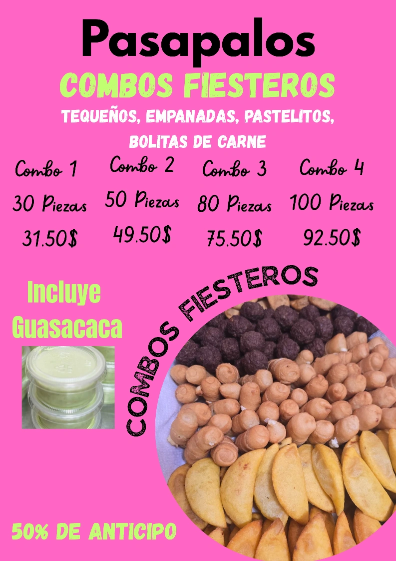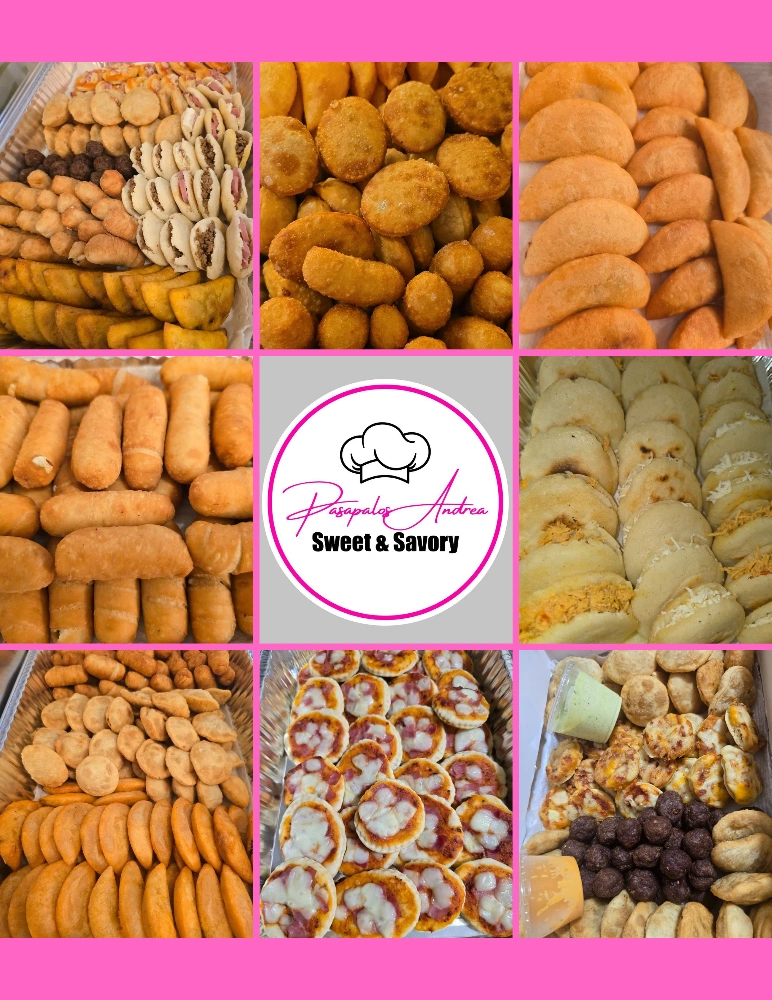 I'm selling delicious sweet and savory treats from Pasapalos Andrea! They offer a variety of options, including tequeños, mini-cachapas, and combos fiestros with empanadas and pastelitos. Perfect for any occasion!