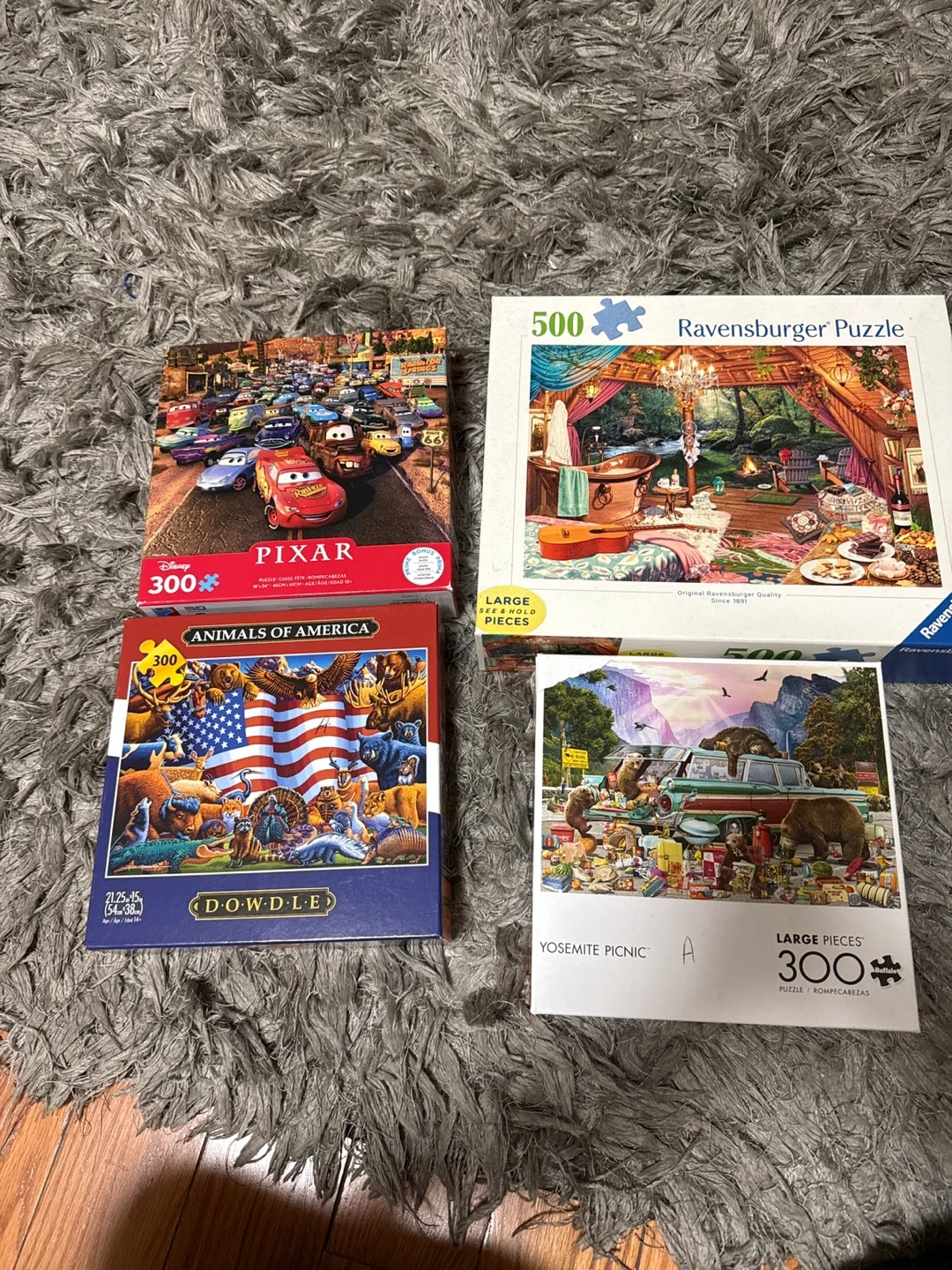 Selling a variety of puzzles! Includes: - Disney Pixar Cars, 300 pieces - Ravensburger Puzzle, 500 pieces - Dowdle Animals of America, 300 pieces - Yosemite Picnic, 300 pieces