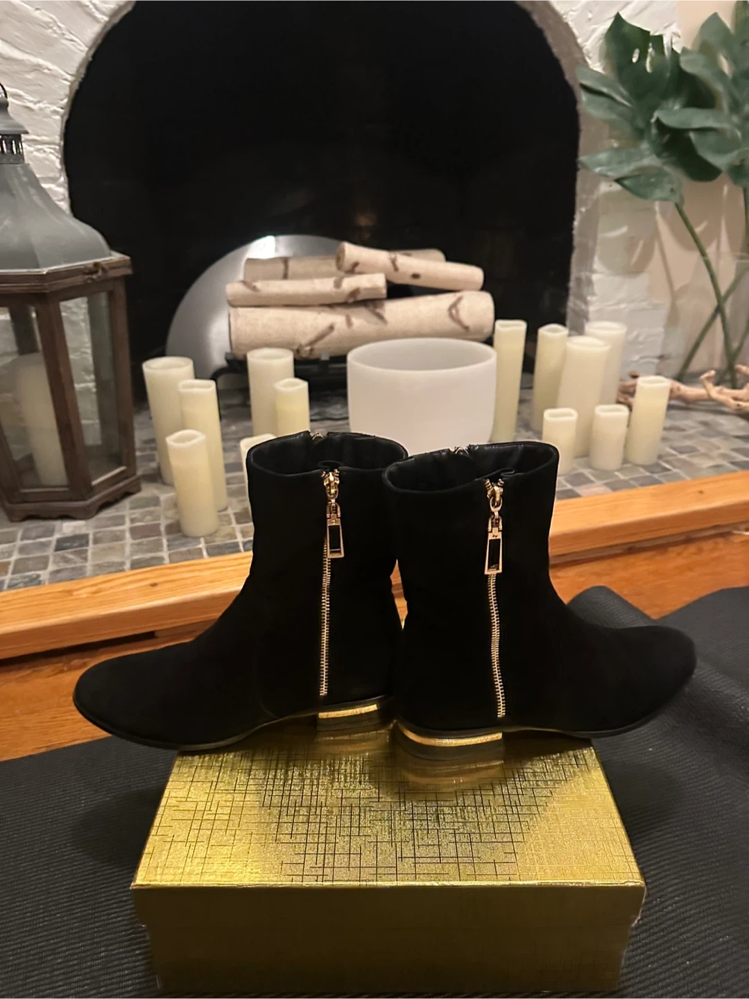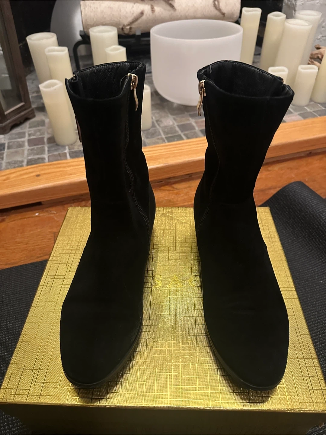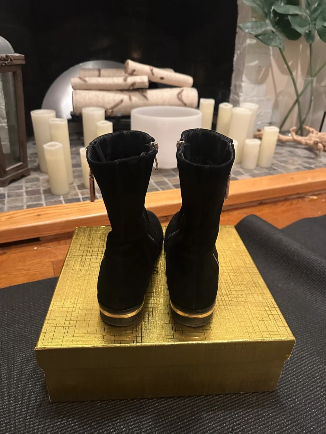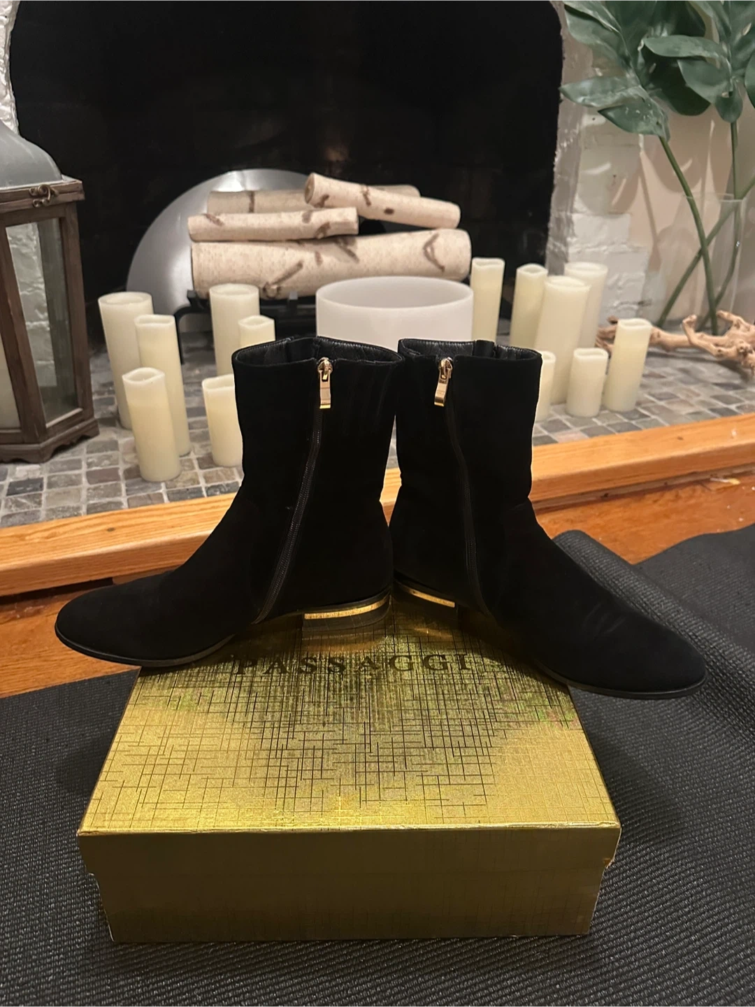65Selling a pair of black ankle boots from passarggi . The box indicates the size is 40, which is equivalent to a US size 9. These boots feature a sleek design with a gold accent. Perfect for any occasion! Lightly used. Suede. Super comfortable