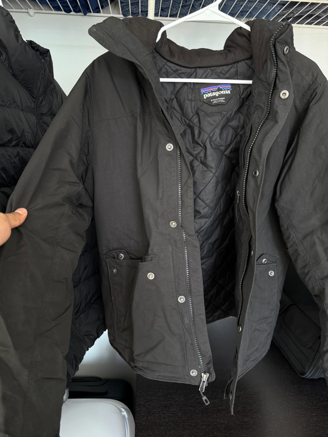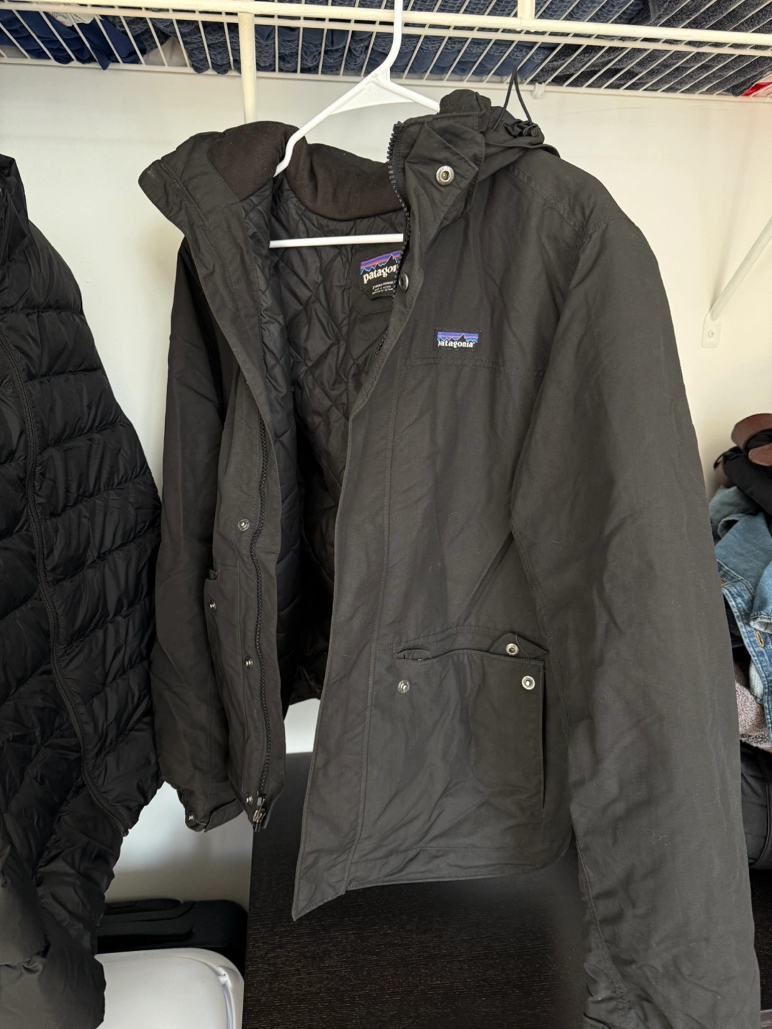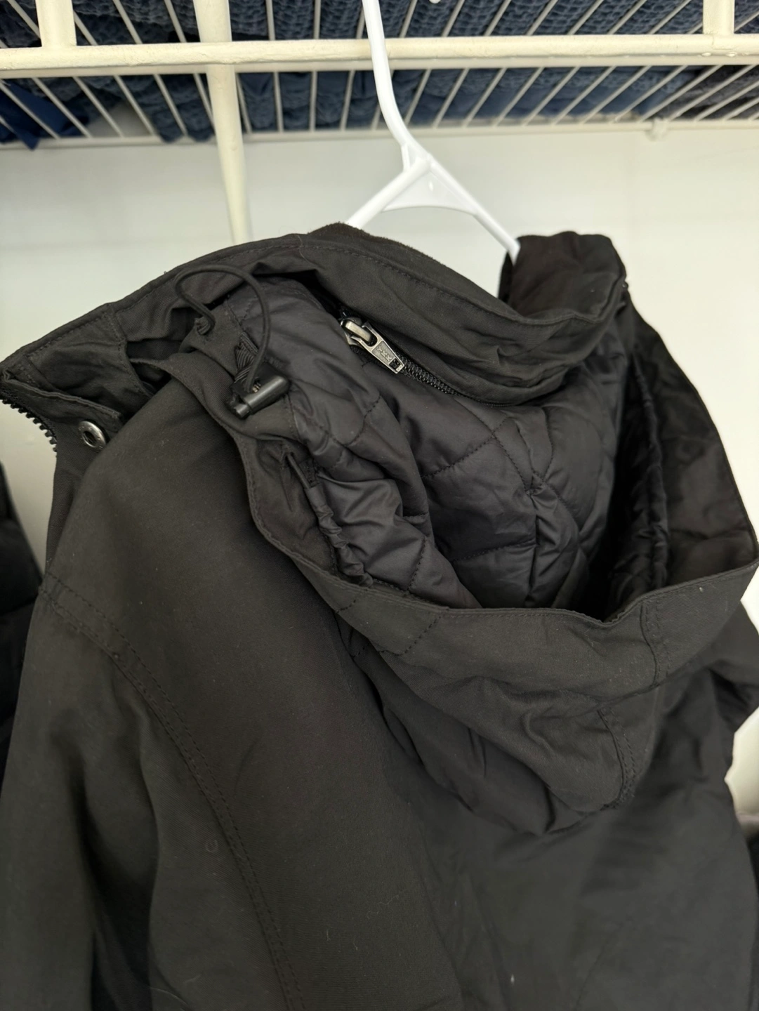 119Men's black insulated jacket. Features a removable hood, zipper closure, and multiple pockets. Good for cold weather. No rips or stains, used quite minimally.