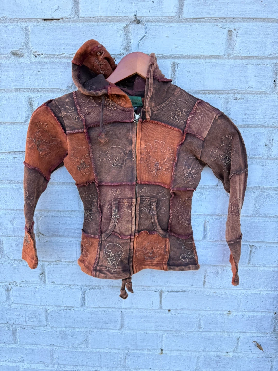 Unique patchwork hoodie with skull designs! It has a full zip and a hood, perfect for layering or a standout piece. Size M