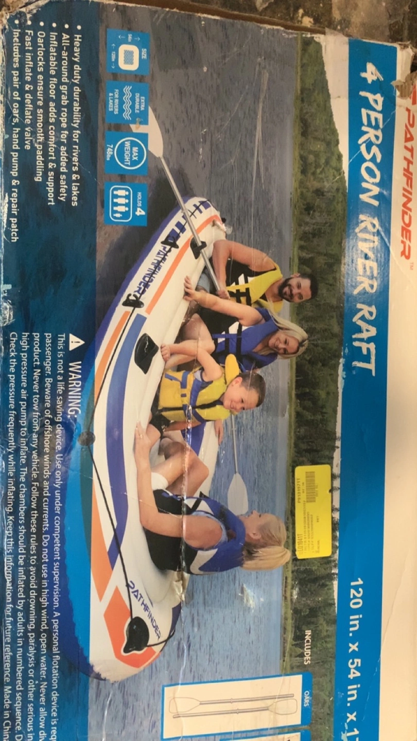 Selling a Pathfinder 4-Person River Raft! It's 120 inches long and 54 inches wide. This raft is extra durable, perfect for rivers and lakes. It can hold up to 4 people with a max weight of 748 lbs. It’s missing the oars and hand pump It’s never been inflated or used It also features heavy-duty durability, an all-around grab rope for added safety, an inflatable floor for comfort, and oarlocks to ensure smooth paddling