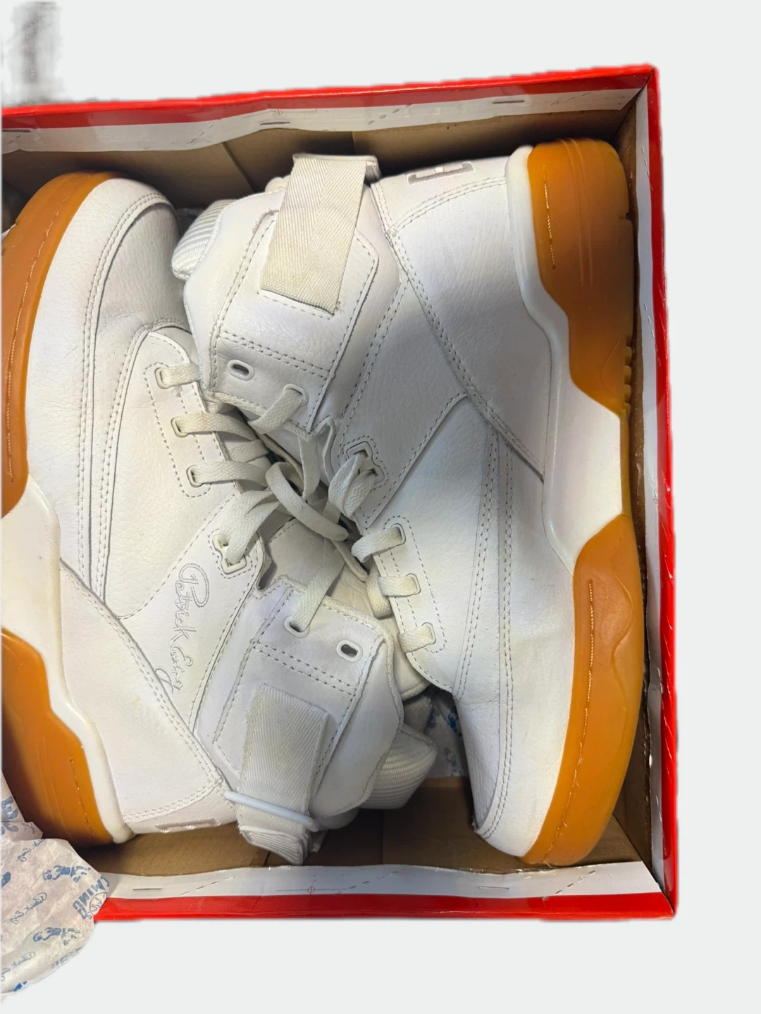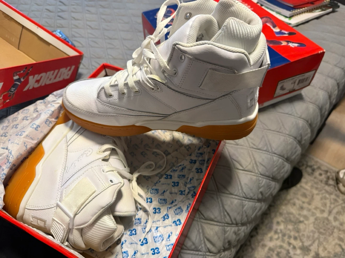 Selling a pair of Patrick Ewing 13 Hi sneakers in white with gum soles, size 9. These shoes are in great condition and come with the original box. A classic basketball shoe with a retro look!