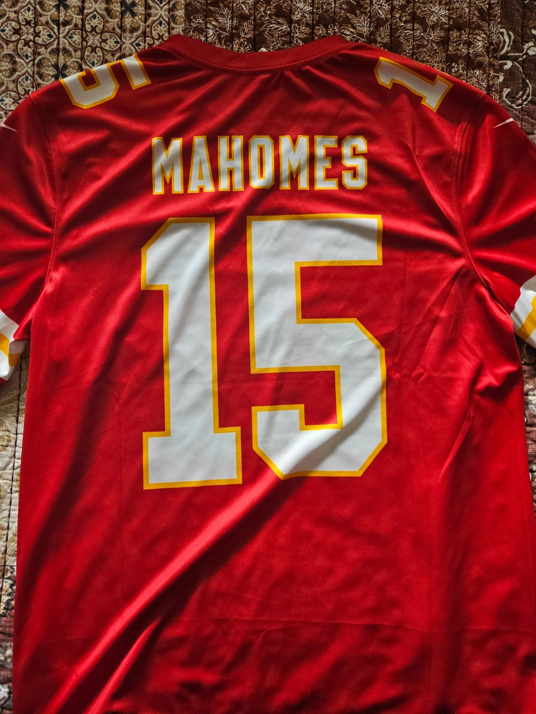 Men's size large Patrick Mahomes Kansas City Chiefs Nike NFL jersey. Red with white and yellow accents. Number 15 on the front and back. Authentic NFL gear.