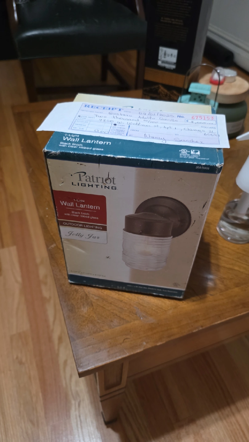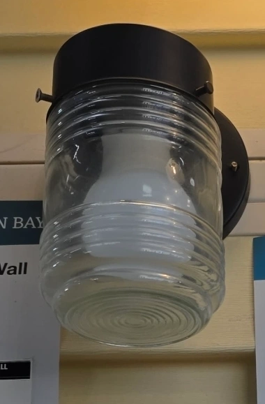 Selling a Patriot Lighting wall lantern, model Jolly Jar. It features a black finish and clear ribbed glass. Great for outdoor lighting! Brand new