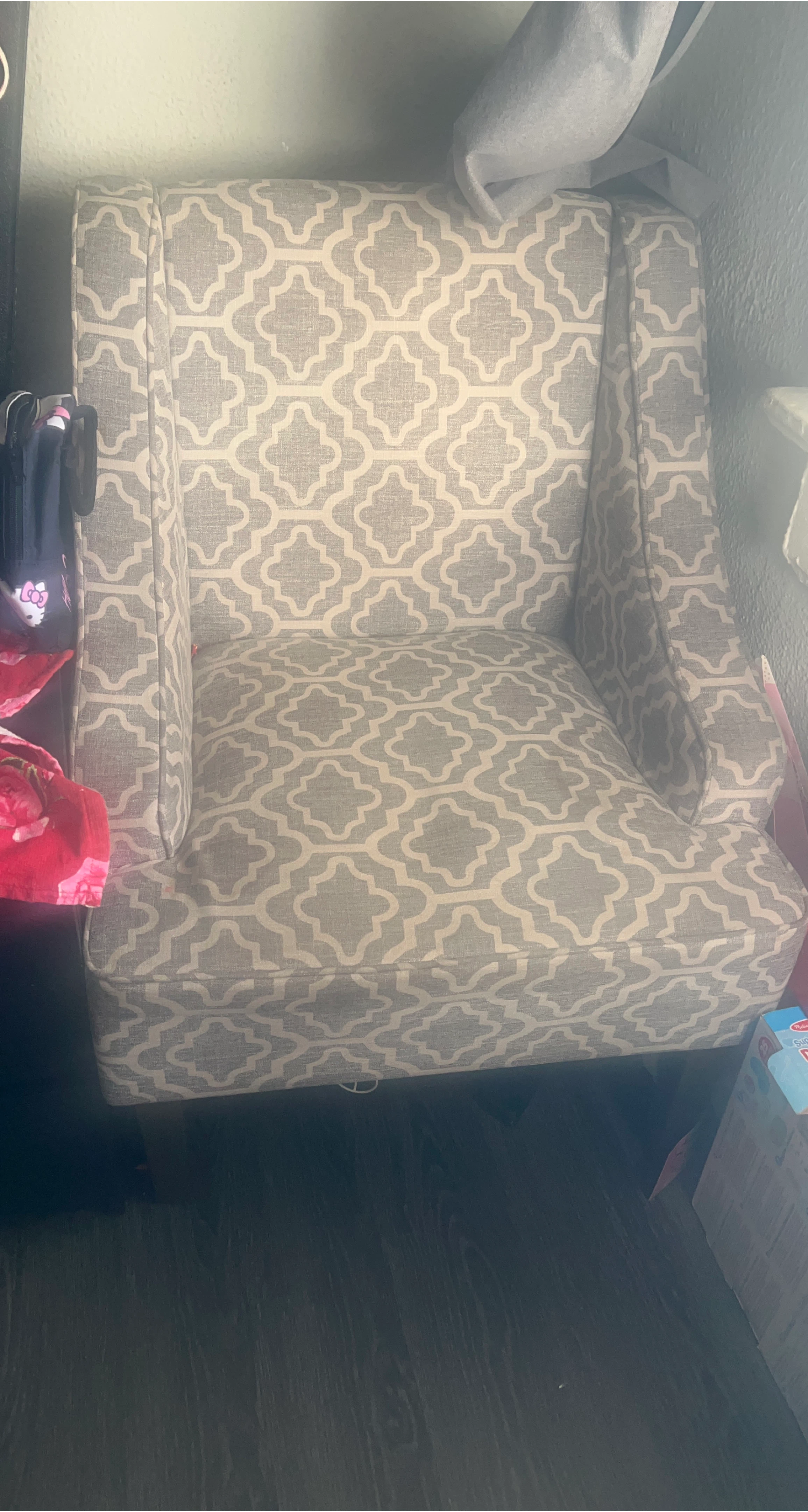 Selling a two comfortable armchair with a gray and beige pattern. It's in used condition and ready for a new home!