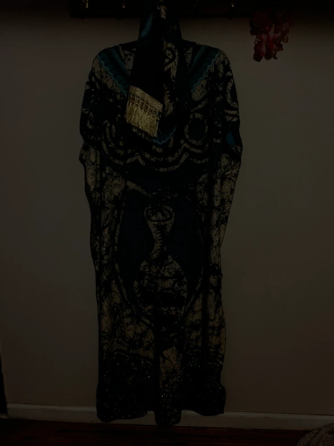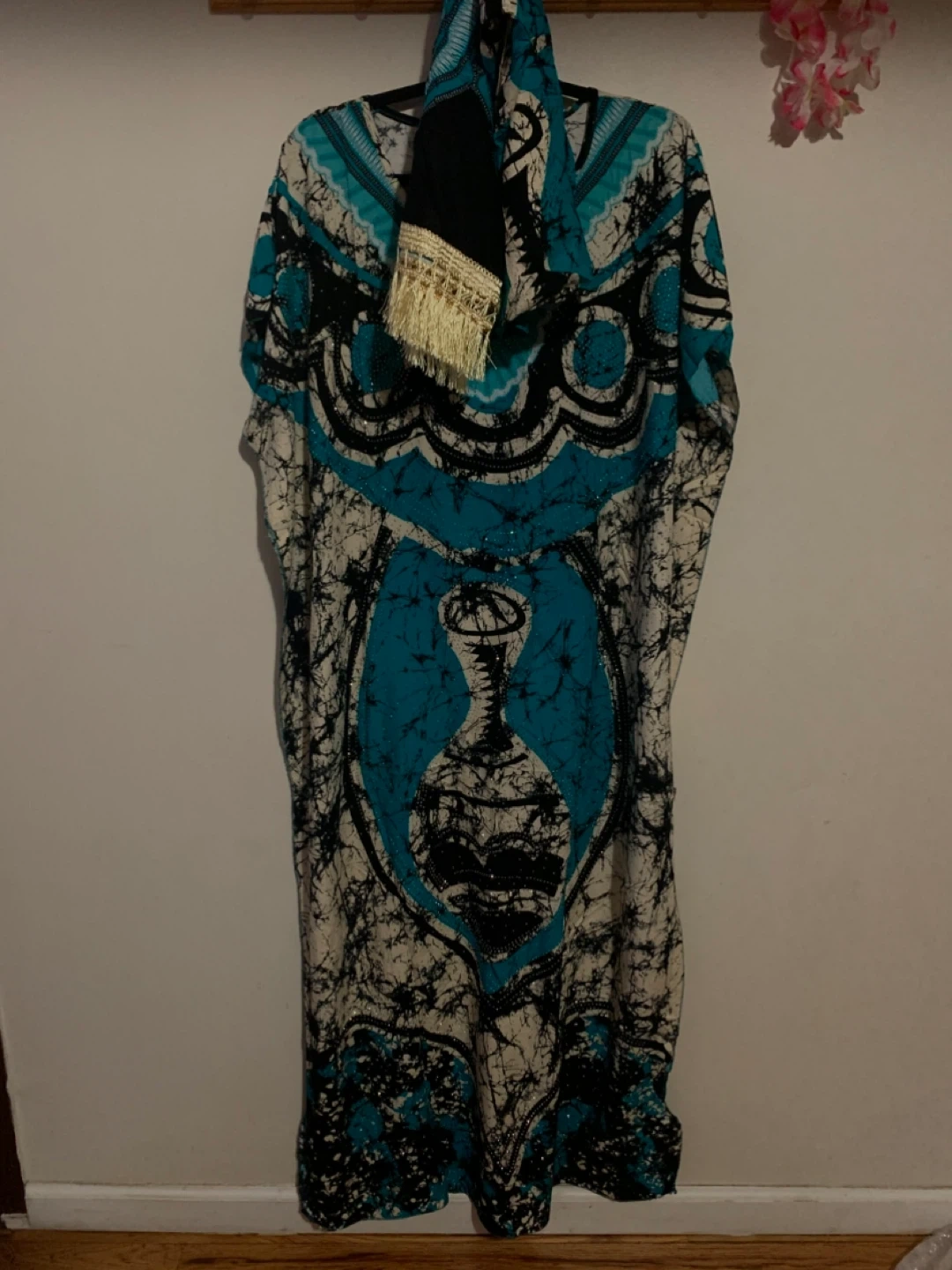 Here's a beautiful patterned caftan dress! It features a unique design with a mix of turquoise, black, and cream colors with rhinestones all around it The dress is comfortable, perfect for lounging or a casual outing